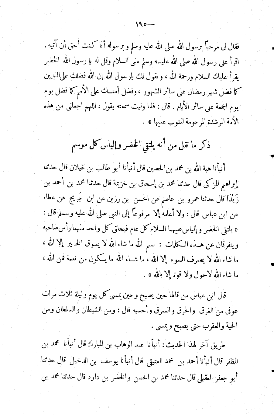 اقْرَأْ عَلَى رَسُولِ اللَّهِ صَلَّى اللَّهُ عَلَيْهِ وَسَلَّمَ مِنِّي السَّلامَ وَقُلْ لَهُ يَا رَسُولَ اللَّهِ الْخَضِرُ يُقْرِأُ عَلَيْكَ السَّلامُ وَرَحْمَةُ اللَّهِ، وَيَقُولُ لَكَ يَا رَسُولَ اللَّهِ إِنَّ اللَّهَ فَضَّلَكَ عَلَى النَّبِيِّينَ كَمَا فَضَلَّ شَهْرَ رَمَضَانَ عَلَى سَائِرِ الشُّهُورِ، وَفَضَّلَ أُمَّتَكَ عَلَى الأُمَمِ كَمَا فَضَّلَ يَوْمَ يَوْمَ الْجُمُعَةِ عَلَى سَائِرِ الأَيَّامِ.