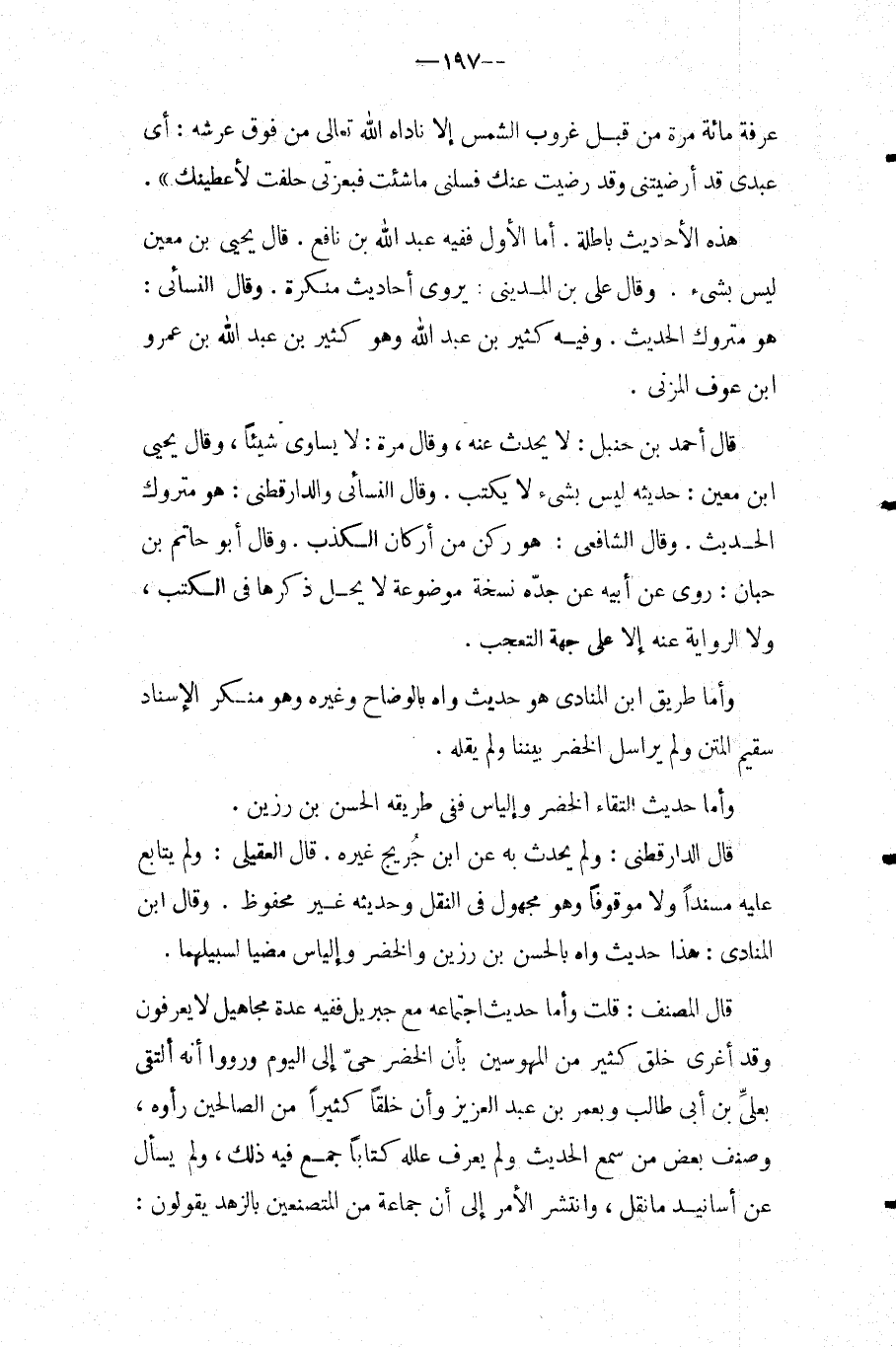 وَأَمَّا طَرِيقُ ابْنُ الْمُنَادِي هُوَ حَدِيثٌ وَاهٍ بِالْوَضَّاحِ وَغَيْرِهِ وَهُوَ مُنْكَرُ الإِسْنَادِ سَقِيمُ الْمَتْنِ وَلَمْ يُرَاسِلِ الْخَضِرُ بَيْنَنَا وَلَمْ يَقُلْهُ.
