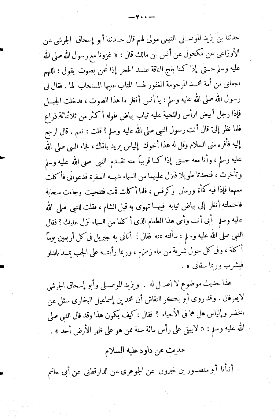 حَدِيث عَن دَاوُد عَلَيْهِ السَّلامُ أَنْبَأَنَا أَبُو مَنْصُورِ بْنُ خَيْرُونٍ عَنِ الْجَوْهَرِيِّ عَنِ الدَّارَقُطْنِيّ عَن أَبى حَاتِم