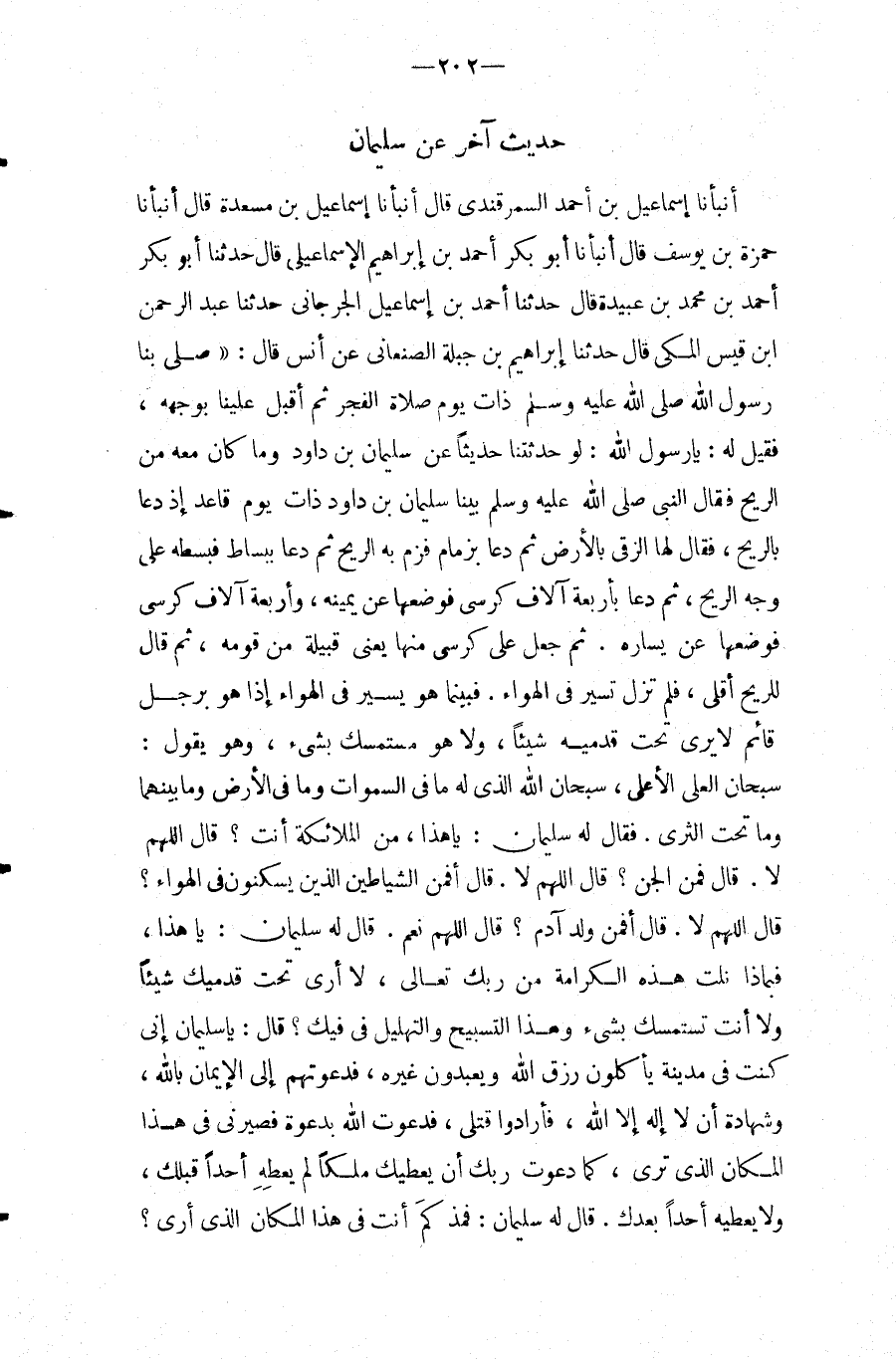 حَدِيث آخر عَن سُلَيْمَان أَنبأَنَا إِسْمَاعِيل بن أَحْمد السَّمرقَنْدِي قَالَ أَنْبَأَنَا إِسْمَاعِيلُ بْنُ مَسْعَدَةَ قَالَ أَنبأَنَا حَمْزَة بن يُوسُف قَالَ أَنبأَنَا أَبُو بكر أَحْمد بْنُ إِبْرَاهِيمَ الإِسْمَاعِيلِيُّ قَالَ حَدَّثَنَا أَبُو بَكْرٍ أَحْمَدُ بْنُ مُحَمَّدِ بْنِ عُبَيْدَةَ قَالَ حَدَّثَنَا أَحْمَدُ بن إِسْمَاعِيل الْجِرْجَانِيّ حَدثنَا عبد الرحمن ابْن قَيْسٍ الْمَكِّيُّ قَالَ حَدَّثَنَا إِبْرَاهِيمُ بْنُ جَبَلَةَ الصَّنَعَانِيُّ عَنْ أَنَسٍ قَالَ: " صَلَّى بِنَا رَسُولُ اللَّهِ صَلَّى اللَّهُ عَلَيْهِ وَسَلَّمَ ذَاتَ يَوْمٍ صَلاةَ الْفَجْرِ ثُمَّ أَقْبَلَ عَلَيْنَا بِوَجْهِهِ، فَقِيلَ لَهُ: يَا رَسُولَ اللَّهِ: لَوْ حَدَّثْتَنَا حَدِيثًا عَنْ سُلَيْمَانَ بْنِ دَاوُدَ وَمَا كَانَ مَعَهُ مِنَ الرِّيحِ فَقَالَ النَّبِي صَلَّى اللَّهُ عَلَيْهِ وَسَلَّمَ بَيْنَا سُلَيْمَانُ بْنُ دَاوُدَ ذَاتَ يَوْمٍ قَاعِدٌ إِذْ دَعَا بِالرِّيحِ، فَقَالَ لَهَا الْزَقِي بِالأَرْضِ ثُمَّ دَعَا بِزِمَامٍ فَزَمَّ بِهِ الرِّيحَ ثُمَّ دَعَا بِبُسَاطٍ فَبَسَطَهُ عَلَى