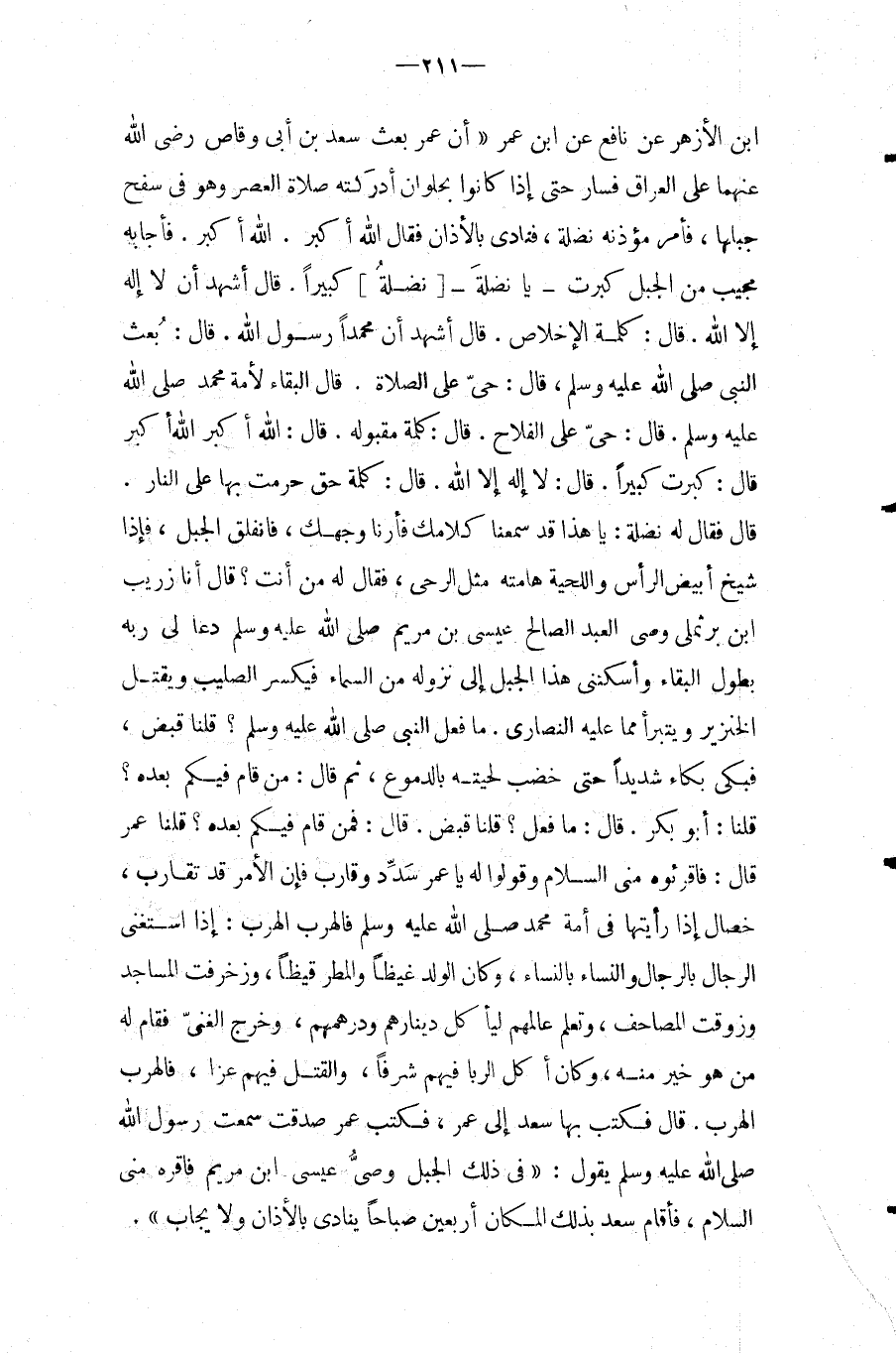 ابْنِ الأَزْهَرِ عَنْ نَافِعٍ عَنِ ابْنِ عُمَرَ " أَنَّ عُمَرَ بَعَثَ سَعْدُ بْنُ أَبِي وَقَّاصٍ رَضِيَ اللَّهُ عَنْهُمَا عَلَى الْعِرَاقِ فَسَارَ حَتَّى إِذَا كَانُوا بِحُلْوَانَ أَدْرَكَتْهُ صَلاةُ الْعَصْرِ وَهُوَ فِي سَفْحِ جَبَلِهَا، فَأَمَرَ مُؤَذِّنُهُ نَضْلَةَ، فَنَادَى بِالأَذَانِ فَقَالَ اللَّهُ أَكْبَرُ.