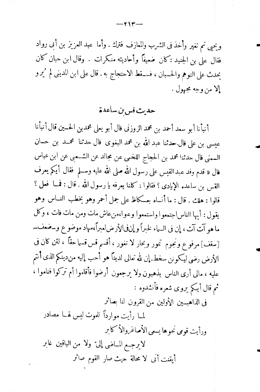 حَدِيث قس بن سَاعِدَة أَنْبَأَنَا أَبُو سَعْدٍ أَحْمَدُ بْنُ مُحَمَّدٍ الزَّوْزَنِيُّ قَالَ أَبُو يَعْلَى مُحَمَّدُ بْنُ الْحُسَيْنِ قَالَ أَنْبَأَنَا عِيسَى بْنُ عَلِيٍّ قَالَ حَدَّثَنَا عبد الله بْنُ مُحَمَّدٍ الْبَغَوِيُّ قَالَ حَدَّثَنَا مُحَمَّدُ بْنُ حَسَّانٍ السَّمْنِيُّ قَالَ حَدَّثَنَا مُحَمَّدُ بْنُ الْحَجَّاجِ اللَّخْمِيُّ عَنْ مُجَالِدٍ عَنِ الشَّعْبِيِّ عَنِ ابْنِ عَبَّاسٍ قَالَ " قَدِمَ وَفْدُ عبد القيس على رَسُول الله صَلَّى اللَّهُ عَلَيْهِ وَسَلَّمَ فَقَالَ أَيُّكُمْ يَعْرِفُ الْقِسَّ بْنَ سَاعِدَةَ الإِيَادِيَّ؟ فَقَالُوا: كُلُّنُا يَعْرِفُهُ يَا رَسُولَ اللَّهِ.