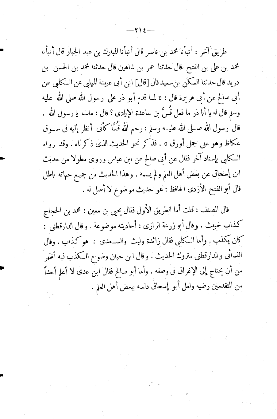 طَرِيق آخر: أَنْبَأَنَا مُحَمَّدُ بْنُ نَاصِرٍ قَالَ أَنْبَأَنَا الْمُبَارَكُ بْنُ عَبْدِ الْجَبَّارِ قَالَ أَنْبَأَنَا مُحَمَّدُ بْنُ عَلِيِّ بْنِ الْفَتْحِ قَالَ حَدَّثَنَا عُمَرُ بْنُ شَاهِينٍ قَالَ حَدَّثَنَا مُحَمَّدُ بْنُ الْحَسَنِ بْنِ دُرَيْدٍ قَالَ حَدَّثَنَا السَّكَنُ بْنُ سعيد قَالَ [قَالَ] ابْنُ أَبِي عُيَيْنَةَ الْمُهَلَّبِيُّ عَنِ الْكَلْبِيِّ عَنْ أَبِي صَالِحٍ عَنْ أَبِي هُرَيْرَةَ قَالَ: " لَمَّا قَدِمَ أَبُو ذَرٍّ عَلَى رَسُولِ الله صَلَّى اللَّهُ عَلَيْهِ وَسَلَّمَ قَالَ لَهُ يَا أَبَا ذَرٍّ مَا فَعَلَ قِسُّ بْنُ سَاعِدَةَ لايادى؟ قَالَ: مَاتَ يَا رَسُولَ اللَّهِ.