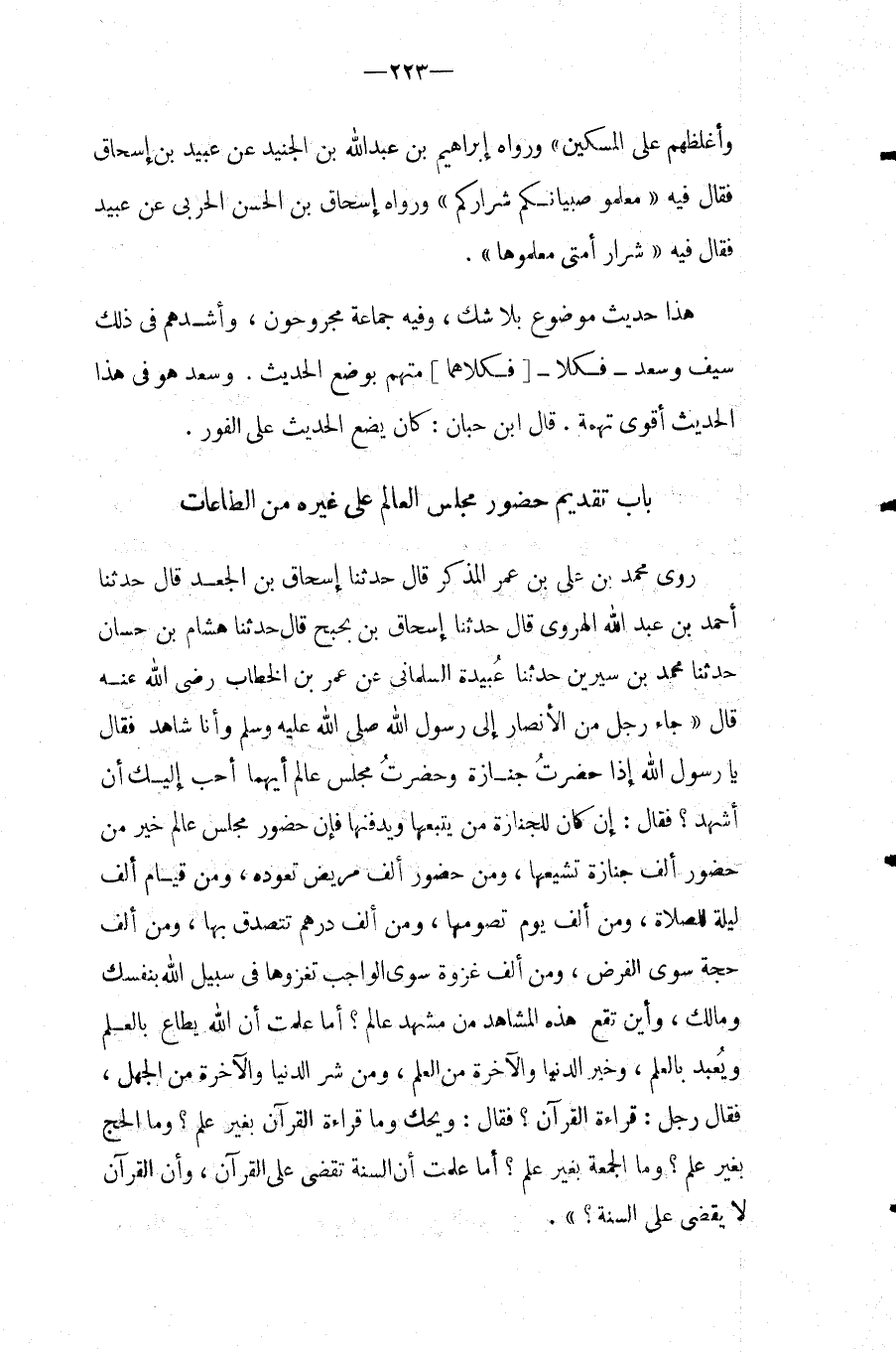 بَاب تَقْدِيم حُضُور مجْلِس الْعَالم على غَيره من الطَّاعَات روى مُحَمَّدُ بْنُ عَلِيِّ بْنِ عُمَرَ الْمُذَكَّرُ قَالَ حَدَّثَنَا إِسْحَاقُ بْنُ الْجَعْدِ قَالَ حَدَّثَنَا أَحَمْدُ بْنُ عبد الله الْهَرَوِيُّ قَالَ حَدَّثَنَا إِسْحَاقُ بْنُ بَحْبَحَ قَالَ حَدَّثَنَا هِشَامُ بْنُ حَسَّانٍ حَدَّثَنَا مُحَمَّدُ بْنُ سِيرِينَ حَدَّثَنَا عُبَيْدَةُ السَّلْمَانِيُّ عَنْ عُمَرَ بن الْخطاب رَضِي الله عَنهُ قَالَ " جَاءَ رَجُلٌ مِنَ الأَنْصَارِ إِلَى رَسُول الله صَلَّى اللَّهُ عَلَيْهِ وَسَلَّمَ وَأَنَا شَاهِدٌ فَقَالَ يَا رَسُولَ اللَّهِ إِذَا حَضَرْتُ جِنَازَةً وَحَضَرْتُ مَجْلِسَ عَالِمٍ أَيُّهُمَا أَحَبُّ إِلَيْكَ أَنْ أَشْهَدَ؟ فَقَالَ: إِنْ كَانَ لِلْجِنَازَةِ مَنْ يَتْبَعُهَا وَيَدْفِنُهَا فَإِنَّ حُضُورَ مَجْلِسِ عَالِمٍ خَيْرٌ مِنْ حُضُورِ أَلْفِ جِنَازَةٍ تُشَيِّعُهَا، وَمِنْ حُضُورِ أَلْفِ مَرِيضٍ تَعُودُهُ، وَمِنْ قِيَامِ أَلْفِ لَيْلَةٍ للصَّلَاة، وَمن ألف يَوْم تصومها، وَمِنْ أَلْفِ دِرْهَمٍ تَتَصَدَّقُ بِهَا، وَمِنْ أَلْفِ حَجَّةٍ سِوَى الْفَرْضِ، وَمِنْ أَلْفِ غَزْوَةٍ سِوَى الْوَاجِبِ تَغْزُوهَا فِي سَبِيلِ اللَّهِ بِنَفْسِكَ وَمَالِكَ، وَأَيْنَ تَقَعُ هَذِهِ الْمَشَاهِدُ مِنْ مَشْهَدِ عَالِمٍ؟ أَمَا عَلِمْتَ أَنَّ اللَّهَ يُطَاعُ بِالْعِلْمِ وَيُعْبَدُ بِالْعِلْمِ، وَخَيْرُ الدُّنْيَا وَالآخِرَةِ مِنَ مِنَ الْعِلْمِ، وَمِنْ شَرِّ الدُّنْيَا وَالآخِرَةِ مِنَ الْجَهْلِ، فَقَالَ رَجُلٌ: قِرَاءَةُ الْقُرْآنِ؟ فَقَالَ: وَيْحَكَ وَمَا قِرَاءَةُ الْقُرْآنِ بِغَيْرِ عِلْمٍ؟ وَمَا الْحَجُّ بِغَيْرِ عِلْمٍ؟ وَمَا الْجُمُعَةُ بِغَيْرِ عِلْمٍ؟ أَمَا عَلِمْتَ أَنَّ السُّنَّةَ تَقْضِي عَلَى الْقُرْآنِ، وَأَنَّ الْقُرْآنَ