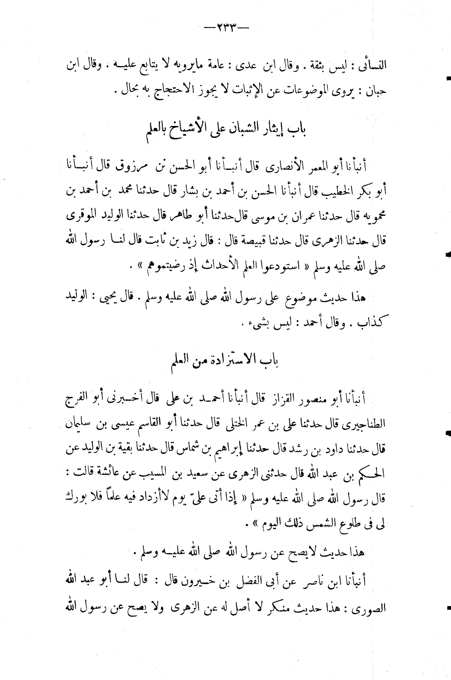 بَاب الاستزادة من الْعلم أَنبأَنَا أَبُو مَنْصُور الْقَزاز قَالَ أَنْبَأَنَا أَحْمَدُ بْنُ عَلِيٍّ قَالَ أَخْبَرَنِي أَبُو الْفَرَجِ الطَّنَاجِيرِيُّ قَالَ حَدَّثَنَا عَلِيُّ بْنُ عُمَرَ الْخُتُّلِيُّ قَالَ حَدَّثَنَا أَبُو الْقَاسِمِ عِيسَى بْنُ سُلَيْمَانَ قَالَ حَدَّثَنَا دَاوُدُ بْنُ رُشْدٍ قَالَ حَدَّثَنَا إِبْرَاهِيمُ بْنُ شَمَّاسٍ قَالَ حَدَّثَنَا بَقِيَّةُ بْنُ الْوَلِيدِ عَنِ الْحَكَمِ بْنِ عبد الله قَالَ حَدَّثَنِي الزُّهْرِيُّ عَنْ سَعِيدِ بْنِ الْمُسَيِّبِ عَنْ عَائِشَةَ قَالَتْ: قَالَ رَسُول الله صَلَّى اللَّهُ عَلَيْهِ وَسَلَّمَ " إِذَا أَتَى عَلَيَّ يَوْمٌ لَا أَزْدَادُ فِيهِ عِلْمًا فَلا بُورِكَ لِي فِي طُلُوعِ الشَّمْسِ ذَلِكَ الْيَوْمَ ".