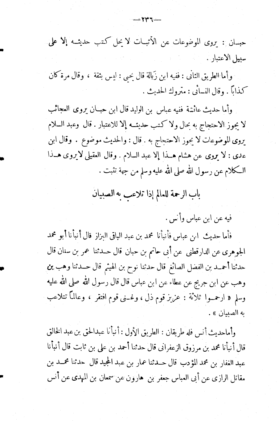 فَأَما حَدِيث ابْن عَبَّاس فَأَنْبَأَنَا مُحَمَّدُ بْنُ عَبْدِ الْبَاقِي الْبَزَّازُ قَالَ أَنْبَأَنَا أَبُو مُحَمَّدٍ الْجَوْهَرِي عَن الدَّارَقُطْنِيّ عَن أبي حَاتِمِ بْنِ حِبَّانَ قَالَ حَدَّثَنَا عُمَرُ بْنُ سِنَانٍ قَالَ حَدَّثَنَا أَحْمَدُ بْنُ الْفَضْلِ الصَّائِغُ قَالَ حَدَّثَنَا نُوحُ بْنُ الْهَيْثَمِ قَالَ حَدَّثَنَا وَهْبُ بْنُ وَهْبٍ عَنِ ابْنِ جُرَيْجٍ عَنْ عَطَاءٍ عَنْ ابْنِ عَبَّاسٍ قَالَ قَالَ رَسُولُ الله صَلَّى اللَّهُ عَلَيْهِ وَسَلَّمَ " ارْحَمُوا ثَلاثَةً: عَزِيزَ قَوْمٍ ذَلَّ، وَغَنِيَّ قَوْمٍ افْتَقَرَ، وَعَالِمًا تَتَلاعَبُ بِهِ الصِّبْيَانُ ".