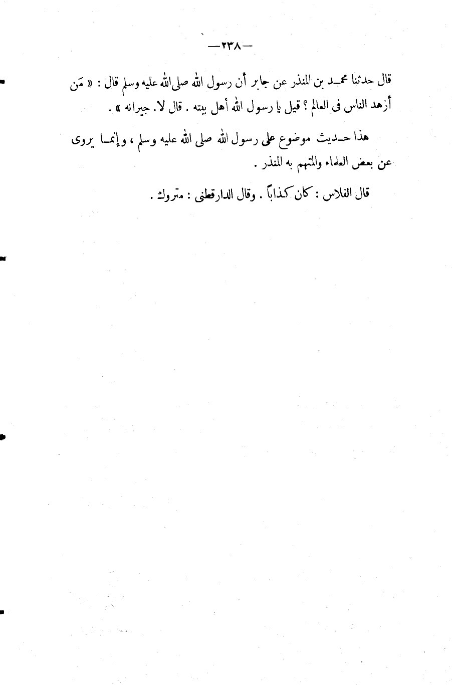 قَالَ حَدَّثَنَا مُحَمَّدُ بْنُ الْمُنْذِرِ عَنْ جَابِرٍ أَنَّ رَسُولَ اللَّهِ صَلَّى اللَّهُ عَلَيْهِ وَسَلَّمَ قَالَ: " مَنْ أَزْهَدُ النَّاسِ فِي الْعَالَمِ؟ قِيلَ يَا رَسُولَ اللَّهِ أَهْلُ بَيْتِهِ.