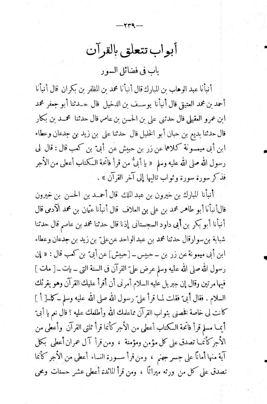 أَبْوَاب تتَعَلَّق بِالْقُرْآنِ بَاب فِي فَضَائِل السُّور أَنبأَنَا عبد الْوَهَّاب بن الْمُبَارك قَالَ أَنْبَأَنَا مُحَمَّدُ بْنُ الْمُظَفَّرِ بْنِ بَكْرَانَ قَالَ أَنْبَأَنَا أَحْمَدُ بْنُ مُحَمَّدٍ الْعَتِيقِيُّ قَالَ أَنْبَأَنَا يُوسُف بن الدخيل قَالَ حَدثنَا أَبُو جَعْفَر مُحَمَّد ابْن عَمْرٍو الْعُقَيْلِيُّ قَالَ حَدَّثَنِي عَلِيُّ بْنُ الْحَسَنِ بْنِ عَامِرٍ قَالَ حَدَّثَنَا مُحَمَّدُ بْنُ بَكَّارٍ قَالَ حَدَّثَنَا بَدِيعُ بْنُ حَبَّانَ أَبُو الْخَلِيلِ قَالَ حَدَّثَنَا عَلِيُّ بْنُ زيد بن جدعَان وَعَطَاء ابْن أَبِي مَيْمُونَةَ كِلاهُمَا عَنْ زِرِّ بْنِ حُبَيْشٍ عَنْ أُبَيِّ بْنِ كَعْبٍ قَالَ: قَالَ لِي رَسُولُ الله صَلَّى اللَّهُ عَلَيْهِ وَسَلَّمَ " يَا أُبَيُّ مَنْ قَرَأَ فَاتِحَةَ الْكِتَابِ أُعْطِيَ مِنَ الأَجْرِ فَذَكَرَ سُورَةً سُورَةً وَثَوَابَ تَالِيهَا إِلَى آخِرِ الْقُرْآنِ ".