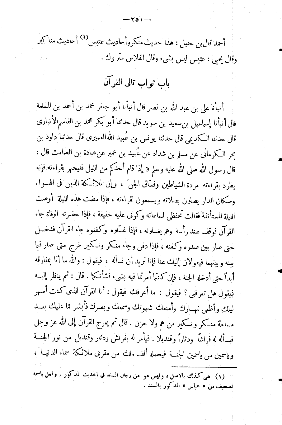 بَاب ثَوَاب تالى الْقُرْآن أَنبأَنَا على بن عبد الله بْنِ نَصْرٍ قَالَ أَنْبَأَنَا أَبُو جَعْفَرٍ مُحَمَّدُ بْنُ أَحْمَدَ بْنِ الْمَسْلَمَةِ قَالَ أَنْبَأَنَا إِسْمَاعِيلُ بْنُ سَعِيدِ بْنِ سُوَيْدٍ قَالَ حَدَّثَنَا أَبُو بَكْرٍ مُحَمَّدُ بْنُ الْقَاسِمِ الأَنْبَارِيُّ قَالَ حَدَّثَنَا الْكُدَيْمِيُّ قَالَ حَدثنَا يُونُس بن عبيد الله الْعُمَيْرِيُّ قَالَ حَدَّثَنَا دَاوُدُ بْنُ بَحْرٍ الْكَرْمَانِيُّ عَنْ مُسْلِمِ بْنِ شَدَّادٍ عَنْ عُبَيْدِ بْنِ عُمَيْرٍ عَنْ عُبَادَةَ بْنِ الصَّامِتِ قَالَ: قَالَ رَسُول الله صَلَّى اللَّهُ عَلَيْهِ وَسَلَّمَ " إِذَا قَامَ أَحَدُكُمْ مِنَ اللَّيْلِ فَلْيَجْهَرْ بِقِرَاءَتِهِ فَإِنَّهُ يَطْرُدُ بِقِرَاءَتِهِ مَرَدَةَ الشَّيَاطِينِ وَفُسَّاقَ الْجِنِّ، وَإِنَّ الْمَلائِكَةَ الَّذِينَ فِي الْهَوَاءِ وَسُكَّانَ الدَّارِ يُصَلُّونَ بِصَلاتِهِ وَيَسْمَعُونَ لِقِرَاءَتِهِ، فَإِذَا مَضَتْ هَذِهِ اللَّيْلَةُ أَوْصَتِ اللَّيْلَةَ الْمُسْتَأْنَفَةَ فَقَالَتْ تَحَفَّظِي لِسَاعَاتِهِ وَكُونِي عَلَيْهِ خَفِيفَةً، فَإِذَا حَضَرَتْهُ الْوَفَاةُ جَاءَ الْقُرْآنُ فَوَقَفَ عِنْدَ رَأْسِهِ وَهُمْ يُغَسِّلُونَهُ، فَإِذَا غَسَّلُوهُ وَكَفَّنُوهُ جَاءَ الْقُرْآنُ فَدَخَل حَتَّى صَارَ بَيْنَ صَدْرِهِ وَكَفَنِهِ، فَإِذَا دُفِنَ وَجَاءَ مُنْكَرٌ وَنَكِيرٌ خَرَجَ حَتَّى صَارَ فِيمَا
