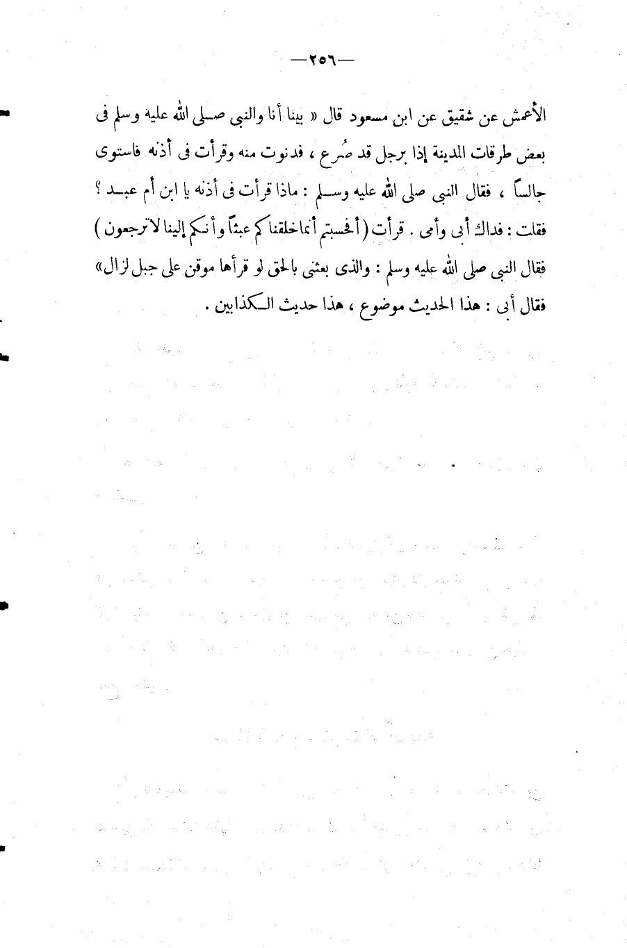 قَرَأْتُ (أَفَحَسِبْتُمْ أَنَّمَا خَلَقْنَاكُمْ عَبَثًا وَأَنَّكُمْ إِلَيْنَا لَا تُرْجَعُونَ) فَقَالَ النَّبِيُّ صَلَّى اللَّهُ عَلَيْهِ وَسَلَّمَ: وَالَّذِي بَعَثَنِي بِالْحَقِّ لَوْ قَرَأَهَا مُوقِنٌ عَلَى جَبَلٍ لَزَالَ " فَقَالَ أَبِي: هَذَا الحَدِيث مَوْضُوع، هَذَا حَدِيث الْكَذَّابين.