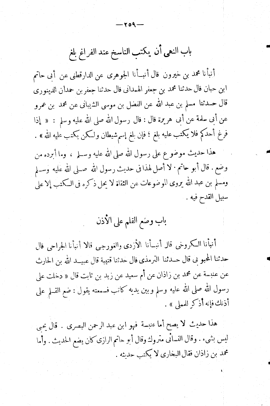 بَاب النَّهْي أَن يكْتب النَّاسِخ عِنْد الْفَرَاغ بلغ أَنبأَنَا مُحَمَّدُ بْنُ خَيْرُونٍ قَالَ أَنْبَأَنَا الْجَوْهَرِي عَن الدَّارَقُطْنِيّ عَن أبي حَاتِم ابْن حَبَّانَ قَالَ حَدَّثَنَا مُحَمَّدُ بْنُ جَعْفَرٍ الْهَمْدَانِيُّ قَالَ حَدَّثَنَا جَعْفَرُ بْنُ حَمْدَانَ الدِّينَوَرِيُّ قَالَ حَدَّثَنَا مُسلم بن عبد الله عَنِ الْفَضْلِ بْنِ مُوسَى الشَّيْبَانِيِّ عَنْ مُحَمَّدِ بْنِ عَمْرٍو عَنْ أَبِي سَلَمَةَ عَنْ أَبِي هُرَيْرَةَ قَالَ: قَالَ رَسُول الله صَلَّى اللَّهُ عَلَيْهِ وَسَلَّمَ: " إِذَا فَرَغَ أَحَدُكُمْ فَلا يَكْتُبُ عَلَيْهِ بَلَغ، فَإِنَّ بَلَغَ اسْمُ شَيْطَانَ وَلَكِنْ يَكْتُبُ عَلَيْهِ اللَّهُ ".