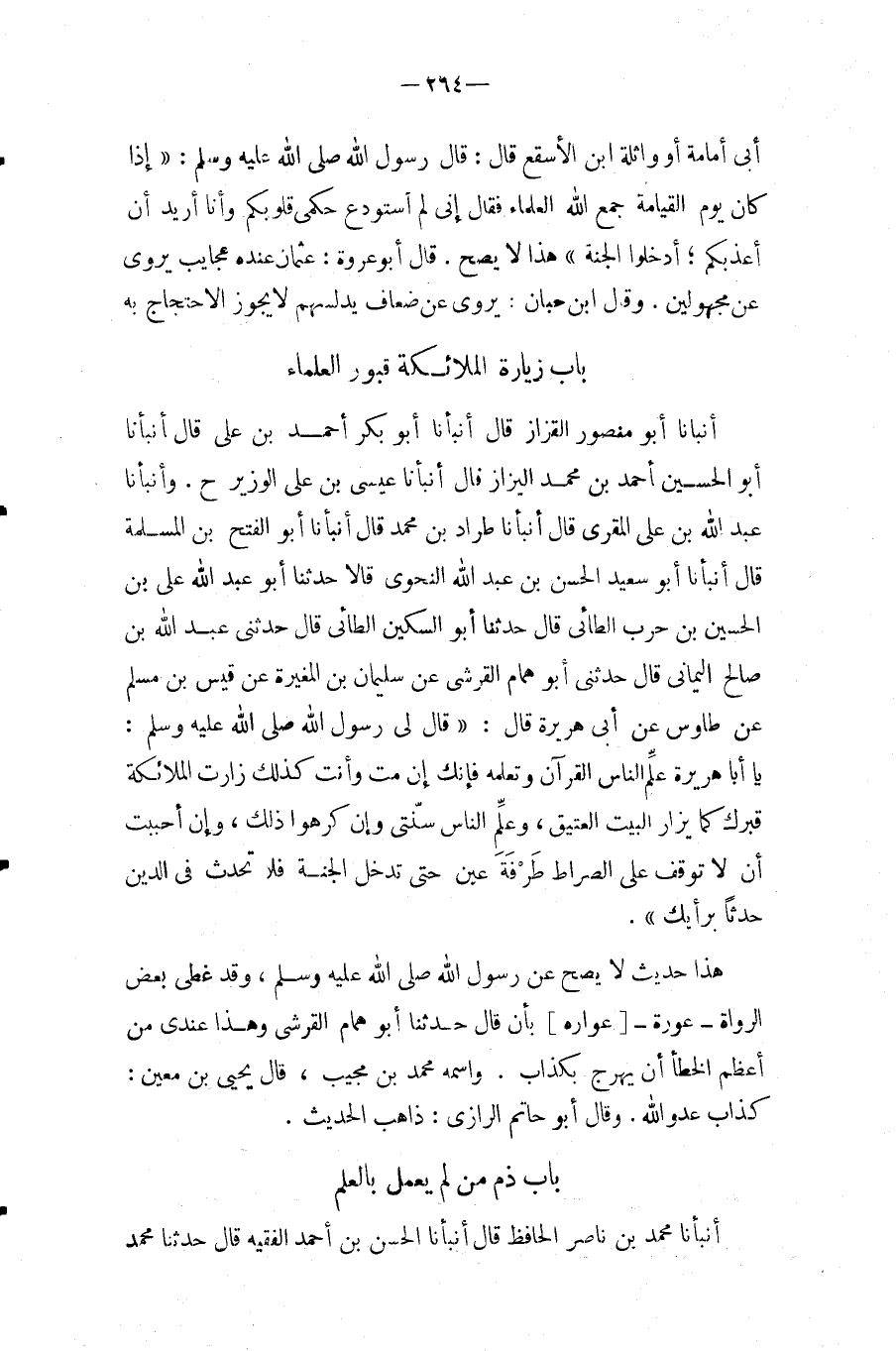 وَقَالَ ابْنُ حِبَّانَ: يَرْوِي عَنِ ضِعَاف يدلسهم لَا يجوز الِاحْتِجَاج بِهِ بَاب زِيَارَة الْمَلَائِكَة قُبُور الْعلمَاء أَنبأَنَا أَبُو مَنْصُور الْقَزاز قَالَ أَنبأَنَا أَبُو بكر أَحْمد بن عَلِيٍّ قَالَ أَنْبَأَنَا أَبُو الْحُسَيْنِ أَحْمد بن مُحَمَّد اليزاز قَالَ أَنْبَأَنَا عِيسَى بْنُ عَلِيٍّ الْوَزير ح.