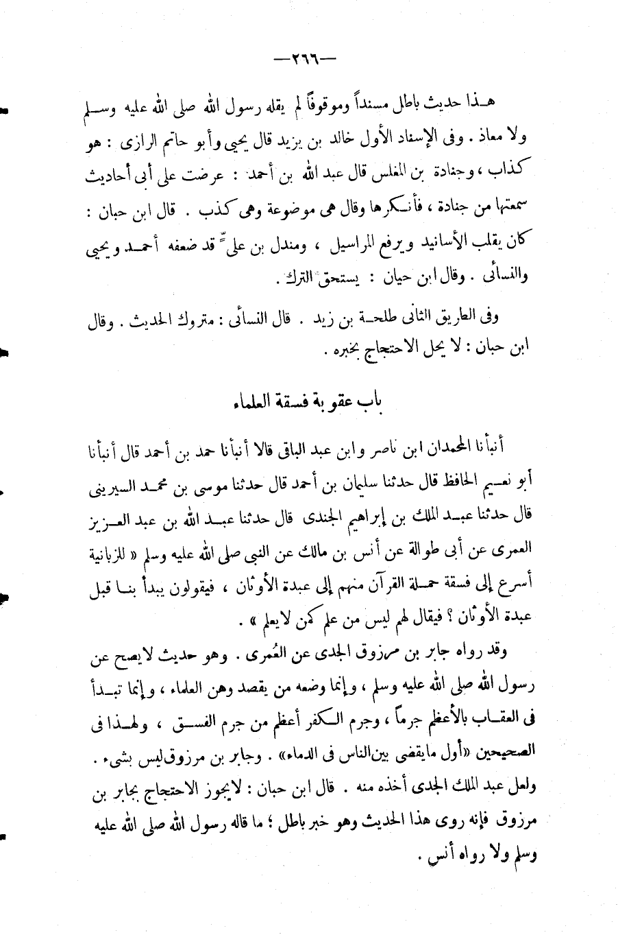 وَهُوَ حَدِيثٌ لَا يَصِحُّ عَنْ رَسُولِ الله صَلَّى اللَّهُ عَلَيْهِ وَسَلَّمَ، وَإِنَّمَا وَضعه من يقْصد وَهن الْعلمَاء، وَإِنَّمَا تبدأ فِي الْعقَاب بالأعظم جرما، وجرم الْكفْر أعظم من جرم الْفسق، وَلِهَذَا فلى الصَّحِيحَيْنِ " أول مَا يقْضى بَين النَّاس فِي الدِّمَاء ".