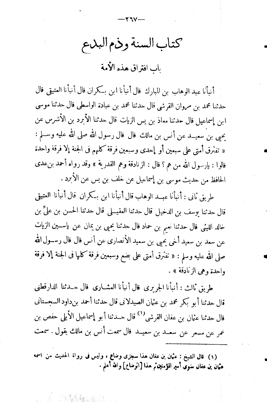 طَرِيق ثَانِي: أَنْبَأَنَا عَبْدُ الْوَهَّابِ قَالَ أَنْبَأَنَا ابْنُ بَكْرَانَ قَالَ أَنْبَأَنَا العتيقي قَالَ حَدثنَا يُوسُف بن الدَّخِيلِ قَالَ حَدَّثَنَا الْعُقَيْلِيُّ قَالَ حَدَّثَنَا الْحَسَنُ بْنُ عَلِيِّ بْنِ خَالِدٍ اللَّيْثِيُّ قَالَ حَدَّثَنَا نُعَيْمُ بْنُ حَمَّادٍ قَالَ حَدَّثَنَا يَحْيَى بْنُ يَمَانٍ عَنْ يَاسِينَ الزَّيَّاتِ عَنْ سَعْدِ بْنِ سَعِيدٍ أَخِي يَحْيَى بْنِ سَعِيدٍ الأَنْصَارِيِّ عَنْ أَنْسٍ قَالَ قَالَ رَسُولُ اللَّهِ صَلَّى اللَّهُ عَلَيْهِ وَسَلَّمَ: " تَفْتَرِقُ أُمَّتِي عَلَى بِضْعٍ وَسَبْعِينَ فِرْقَةً كُلُّهَا فِي الْجَنَّةِ إِلا فِرْقَةً وَاحِدَةً وَهِيَ الزَّنَادِقَةُ ".