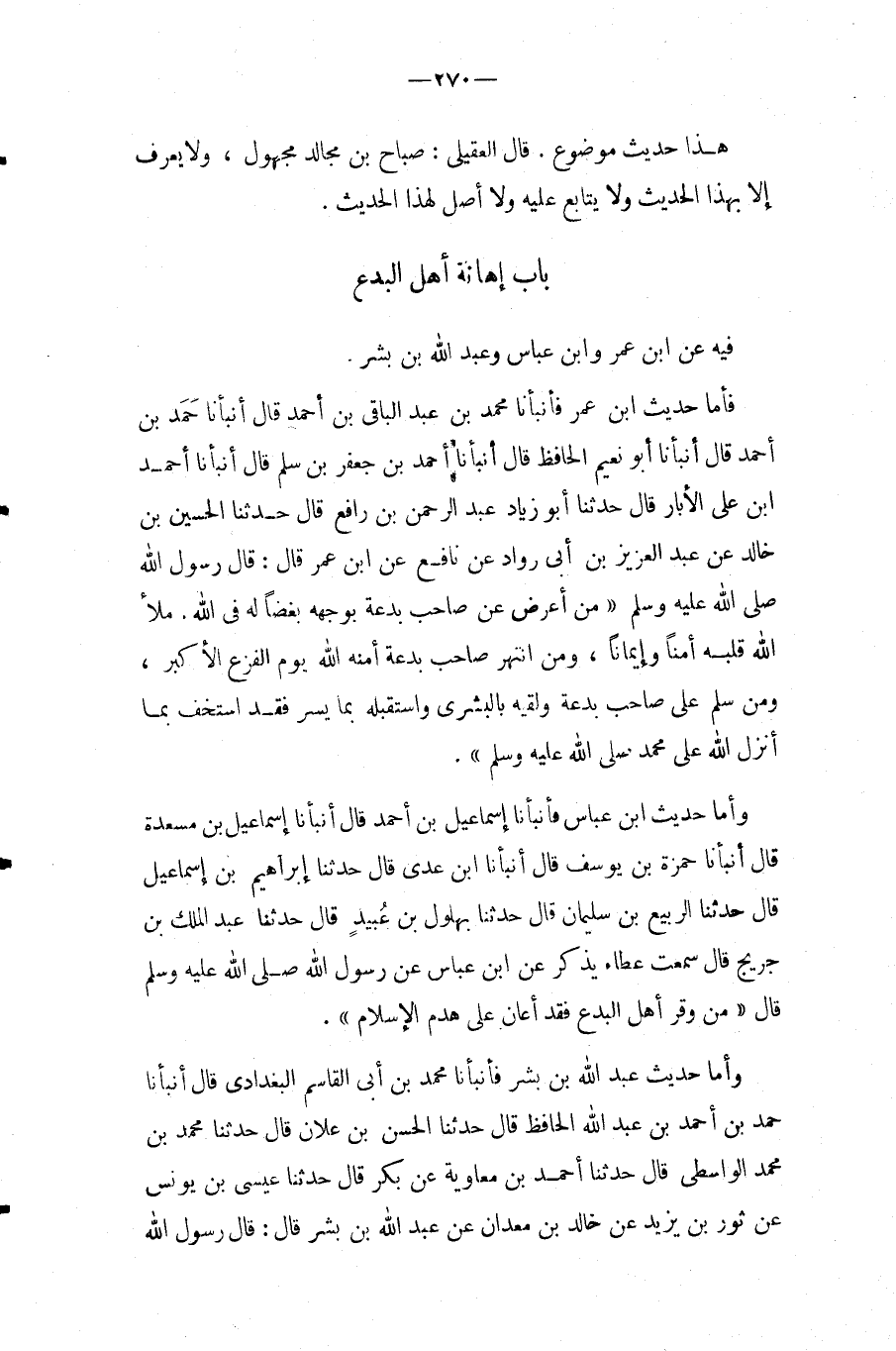 فَأَما حَدِيث ابْن عمر فَأَنْبَأَنَا مُحَمَّدُ بْنُ عَبْدِ الْبَاقِي بْنِ أَحْمَدَ قَالَ أَنْبَأَنَا حَمَدُ بْنُ أَحْمَدَ قَالَ أَنْبَأَنَا أَبُو نُعَيْمٍ الْحَافِظُ قَالَ أَنْبَأَنَا أَحْمَدُ بْنُ جَعْفَرِ بْنِ سلم قَالَ أَنبأَنَا أَحْمد ابْن عَلِيٍّ الأَبَّارُ قَالَ حَدَّثَنَا أَبُو زِيَاد عبد الرحمن بْنُ رَافِعٍ قَالَ حَدَّثَنَا الْحُسَيْنُ بْنُ خَالِدٍ عَنْ عَبْدِ الْعَزِيزِ بْنِ أَبِي رَوَّادٍ عَنْ نَافِعٍ عَنِ ابْنِ عُمَرَ قَالَ: قَالَ رَسُول الله صَلَّى اللَّهُ عَلَيْهِ وَسَلَّمَ " مَنْ أَعْرَضَ عَنْ صَاحِبِ بِدْعَةٍ بِوَجْهِهِ بُغْضًا لَهُ فِي اللَّهِ.