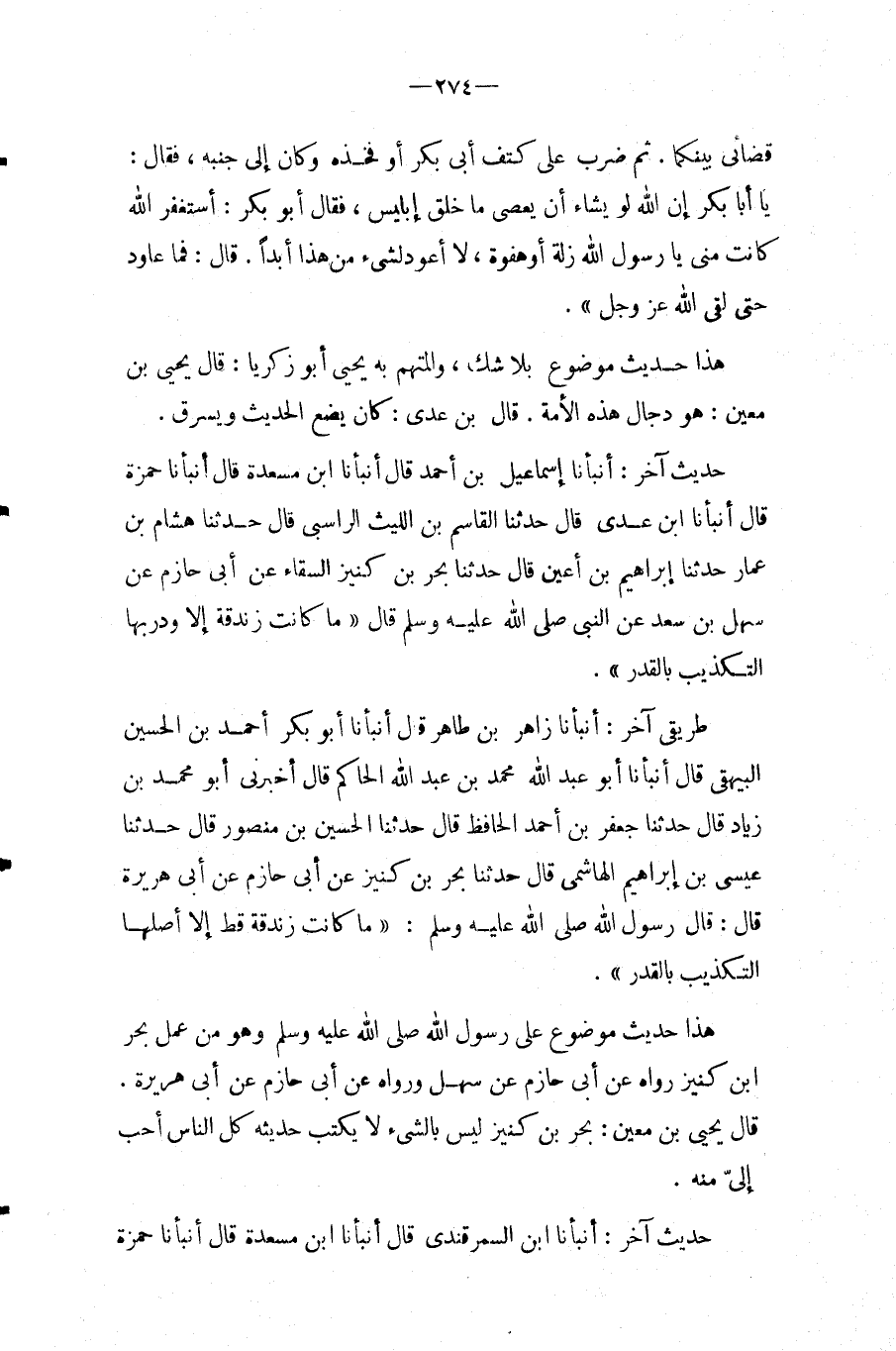 حَدِيث آخر: أَنْبَأَنَا إِسْمَاعِيلُ بْنُ أَحْمَدَ قَالَ أَنْبَأَنَا ابْنُ مَسْعَدَةَ قَالَ أَنْبَأَنَا حَمْزَةُ قَالَ أَنْبَأَنَا ابْنُ عَدِيٍّ قَالَ حَدَّثَنَا الْقَاسِمُ بْنُ اللَّيْثِ الرَّاسِبِيُّ قَالَ حَدَّثَنَا هِشَامُ بْنُ عَمَّارٍ حَدَّثَنَا إِبْرَاهِيمُ بْنُ أَعْيَنَ قَالَ حَدَّثَنَا بَحْرُ بْنُ كُنَيْزٍ السَّقَّاءُ عَنْ أَبِي حَازِمٍ عَنْ سَهْلِ بْنِ سَعْدٍ عَنِ النَّبِيِّ صَلَّى اللَّهُ عَلَيْهِ وَسَلَّمَ قَالَ " مَا كَانَتْ زَنْدَقَةٌ إِلا وَدَرْبُهَا التَّكْذِيبُ بِالْقَدَرِ ".