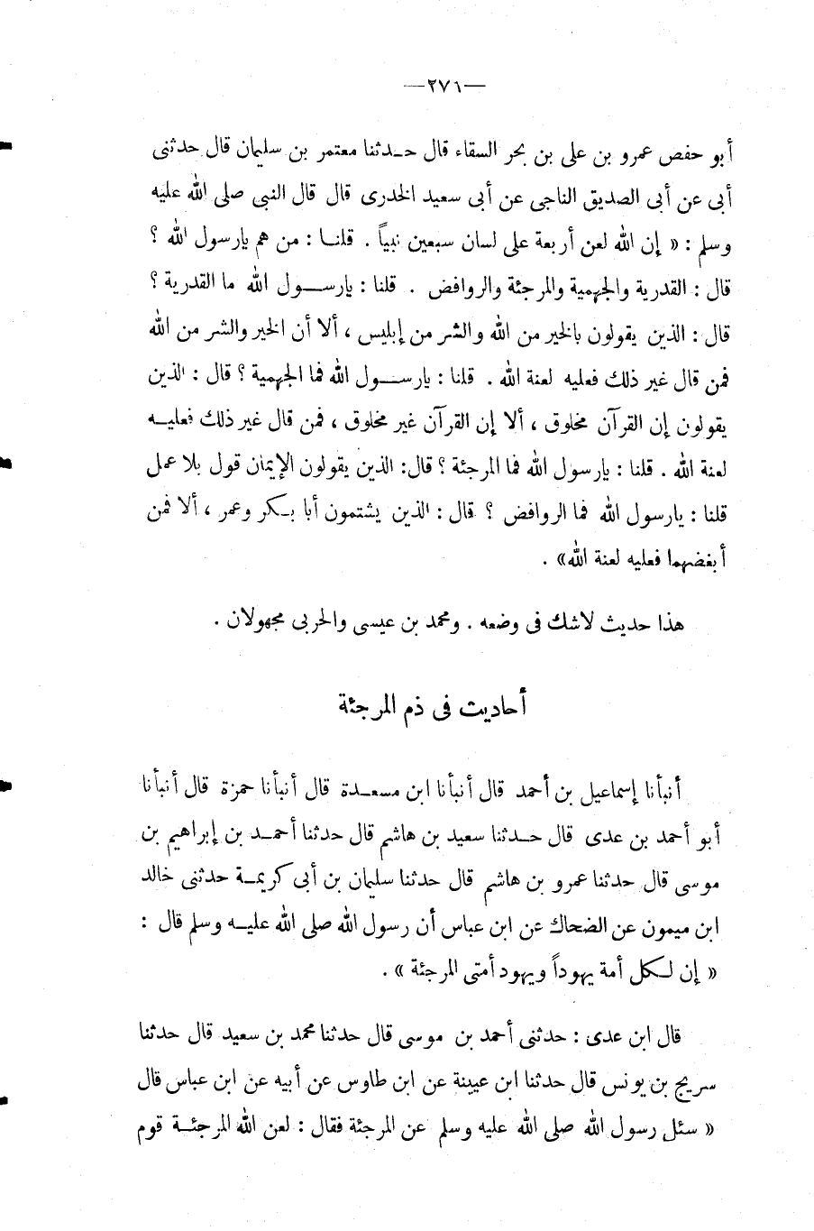 قَالَ ابْنُ عَدِيٍّ: حَدَّثَنِي أَحْمَدُ بْنُ مُوسَى قَالَ حَدَّثَنَا مُحَمَّدِ بْنِ سَعِيدٍ قَالَ حَدَّثَنَا سُرَيْجُ بْنُ يُونُسَ قَالَ حَدَّثَنَا ابْنُ عُيَيْنَةَ عَنِ ابْنِ طَاوُسٍ عَنْ أَبِيهِ عَنِ ابْنِ عَبَّاسٍ قَالَ " سُئِلَ رَسُولُ اللَّهِ صَلَّى اللَّهُ عَلَيْهِ وَسَلَّمَ عَنِ الْمُرْجِئَةِ فَقَالَ: لَعَنَ اللَّهُ الْمُرْجِئَةَ قَوْمٌ