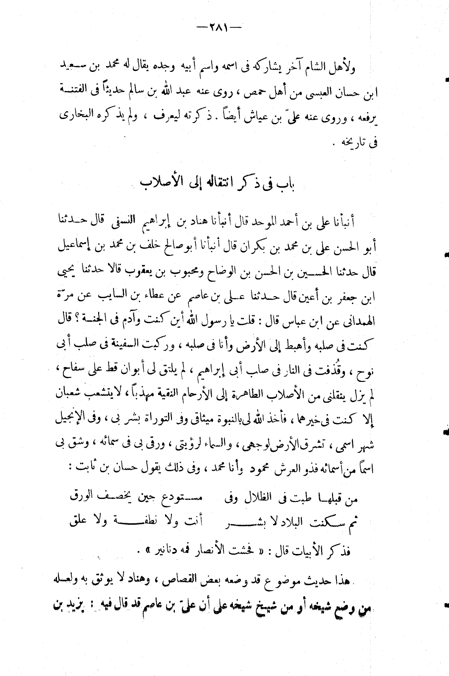 أَنْبَأَنَا عَلَيُّ بْنُ أَحْمَدَ الْمُوَحِّدُ قَالَ أَنْبَأَنَا هَنَّادُ بْنُ إِبْرَاهِيمَ النَّسَفِيُّ قَالَ حَدَّثَنَا أَبُو الْحَسَنِ عَلِيُّ بْنُ مُحَمَّدِ بْنِ بَكْرَانَ قَالَ أَنْبَأَنَا أَبُو صَالِحٍ خَلَفُ بْنُ مُحَمَّدِ بْنِ إِسْمَاعِيلَ قَالَ حَدَّثَنَا الْحُسَيْنُ بْنُ الْحَسَنِ بْنِ الْوَضَّاحِ وَمَحْبُوبُ بْنُ يَعْقُوبَ قَالا حَدثنَا يحيى ابْن جَعْفَرِ بْنِ أَعْيَنَ قَالَ حَدَّثَنَا عَلِيُّ بْنُ عَاصِمٍ عَنْ عَطَاءِ بْنِ السَّايبِ عَنْ مُرَّةَ الْهَمْدَانِيِّ عَنِ ابْنِ عَبَّاسٍ قَالَ: قُلْتُ يَا رَسُولَ اللَّهِ أَيْنَ كُنْتَ وَآدَمُ فِي الْجَنَّةِ؟ قَالَ كُنْتُ فِي صُلْبِهِ وَأُهْبِطَ إِلَى الأَرْضِ وَأَنَا فِي صُلْبِهِ، وَرَكِبْتُ السَّفِينَةَ فِي صُلْبِ أَبِي نُوحٍ، وَقُذِفْتُ فِي النَّارِ فِي صُلْبِ أَبِي إِبْرَاهِيمَ، لَمْ يَلْتَقِ لِي أَبَوَانِ قَطُّ عَلَى سِفَاحٍ، لَمْ يَزَلْ يَنْقُلُنِي مِنَ الأَصْلابِ الطَّاهِرَةِ إِلَى الأَرْحَامِ النَّقِيَّةِ مُهَذَّبًا، لَا يَتَشَعَّبُ شعْبَان إِلَّا كنت فِي خير هما، فَأَخَذَ اللَّهُ لِيَ بِالنُّبُوَّةِ مِيثَاقِي وَفِي التَّوْرَاةِ بَشَّرَ بِي، وَفِي الانجيل شهراسمى، تُشْرِقُ الأَرْضُ لِوَجْهِي، وَالسَّمَاءُ لِرُؤْيَتِي، وَرَقَى بِي فِي سَمَائِهِ، وَشَقَّ بِي اسْمًا مِنْ أَسْمَائِهِ فَذُو الْعَرْشِ مَحْمُودٌ وَأَنَا مُحَمَّدٌ، وَفِي ذَلِكَ يَقُولُ حَسَّانُ بْنُ ثَابِتٍ: مِنْ قَبْلِهَا طِبْتَ فِي الظِّلالِ وَفِي * مُسْتَوْدَعٍ حِينَ يُخْصَفُ الْوَرَقُ ثُمَّ سَكَنْتَ الْبِلادَ لَا بَشَرٌ * أَنْتَ وَلا نُطْفَةٌ وَلا عَلَقٌ فَذَكَرَ الأَبْيَاتَ قَالَ: " فَحَشَتِ الأَنْصَارُ فَمَهُ دَنَانِيرَ ".