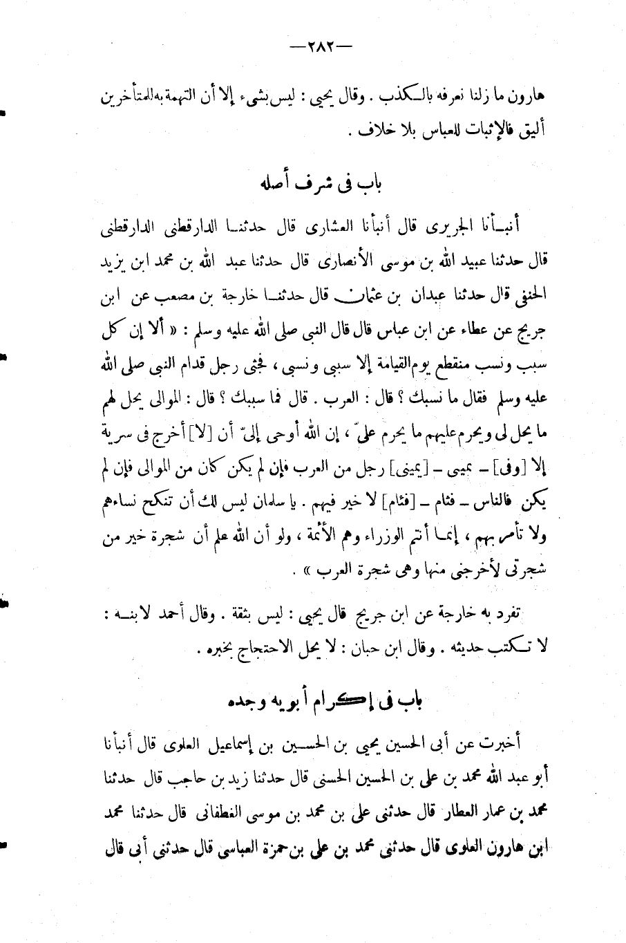 بَاب فِي شرف أَصله أَنْبَأَنَا الْجَرِيرِيُّ قَالَ أَنْبَأَنَا الْعُشَارِيُّ قَالَ حَدثنَا الدَّارَقُطْنِيّ الدَّارَقُطْنِيّ قَالَ حَدثنَا عبيد الله بْنُ مُوسَى الأَنْصَارِيُّ قَالَ حَدَّثَنَا عبد الله بن مُحَمَّد ابْن يَزِيدَ الْحَنَفِيُّ قَالَ حَدَّثَنَا عَبْدَانُ بْنُ عُثْمَانَ قَالَ حَدَّثَنَا خَارِجَةُ بْنُ مُصْعَبٍ عَنِ ابْنِ جُرَيْجٍ عَنْ عَطَاءٍ عَنِ ابْنِ عَبَّاسٍ قَالَ قَالَ النَّبِيُّ صَلَّى اللَّهُ عَلَيْهِ وَسَلَّمَ: " أَلا إِنَّ كُلَّ سَبَبٍ وَنَسَبٍ مُنْقَطِعٌ يَوْمَ الْقِيَامَةِ إِلا سَبَبِي وَنَسَبِي، فَجَثَى رَجُلٌ قُدَّامَ النَّبِيِّ صَلَّى اللَّهُ عَلَيْهِ وَسَلَّمَ فَقَالَ مَا نَسَبُكَ؟ قَالَ: الْعَرَبُ.