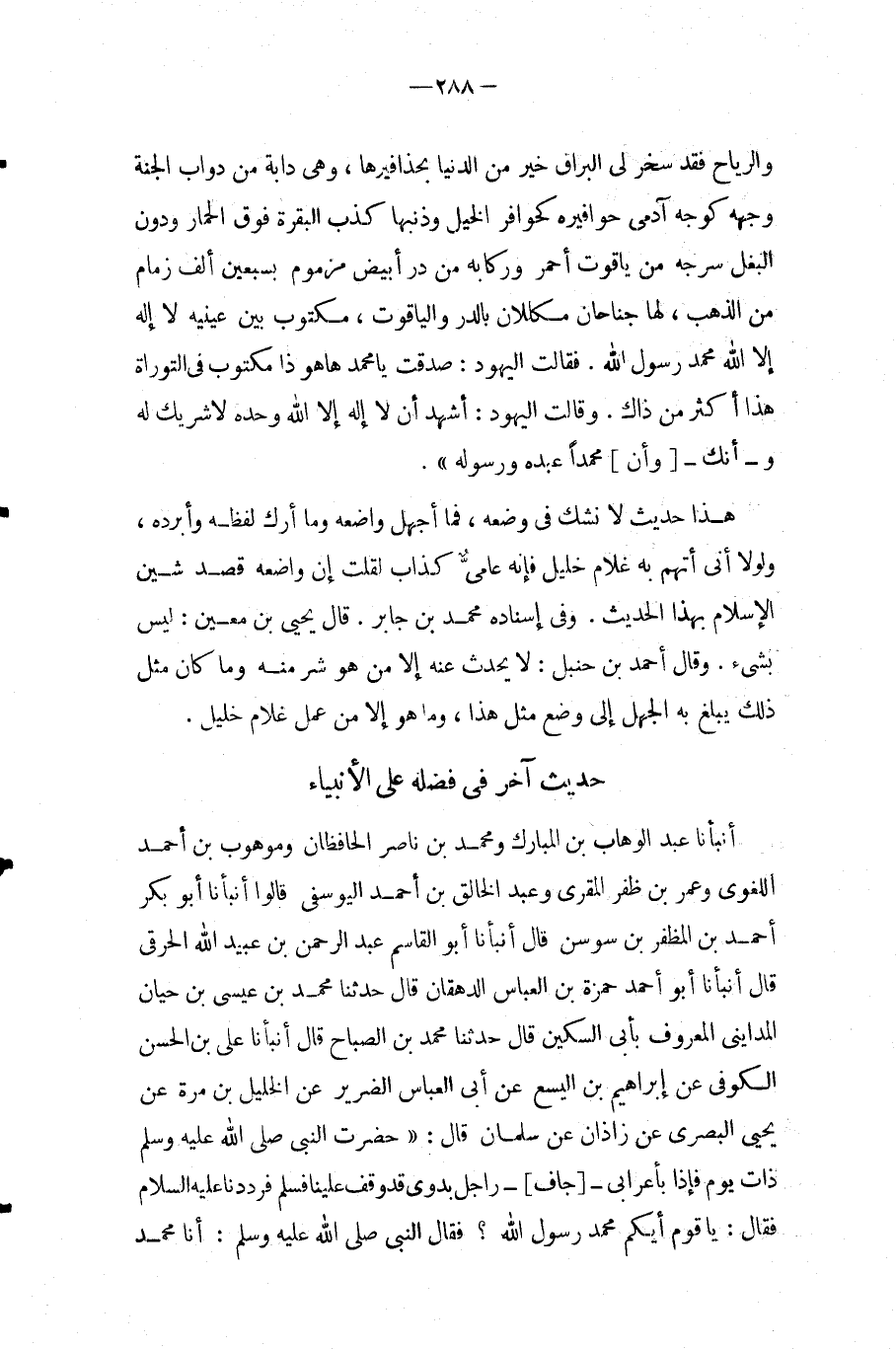 وَالرِّيَاحَ فَقَدْ سَخَّرَ لِيَ الْبُرَاقُ خيرمن الدُّنْيَا بِحَذَافِيرِهَا، وَهِيَ دَابَّةٌ مِنْ دَوَابِّ الْجَنَّةِ وَجْهُهُ كَوَجْهِ آدَمِيٍّ حوافيره كحوافر الْخَيل وذنبها كذب الْبَقَرَةِ فَوْقَ الْحِمَارِ وَدُونَ الْبَغْلِ سِرْجُهُ مِنْ يَاقُوتٍ أَحْمَرَ وَرِكَابُهُ مِنْ دُرٍّ أَبْيَضَ مَزْمُومٌ بِسَبْعِينَ أَلْفَ زِمَامٍ مِنَ الذَّهَبِ، لَهَا جَنَاحَانِ مُكَلَّلانِ بِالدُّرِّ وَالْيَاقُوتِ، مَكْتُوبٌ بَيْنَ عَيْنَيْهِ لَا إِلَهَ إِلا اللَّهُ مُحَمَّدٌ رَسُولُ اللَّهِ.