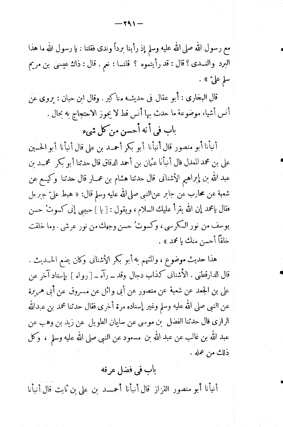 بَاب فِي أَنه أحسن من كل شئ أَنبأَنَا أَبُو مَنْصُورٍ قَالَ أَنْبَأَنَا أَبُو بَكْرٍ أَحْمَدُ بْنُ عَلِيٍّ قَالَ أَنْبَأَنَا أَبُو الْحُسَيْنِ عَلِيُّ بْنُ مُحَمَّدٍ الْمُعَدَّلُ قَالَ أَنْبَأَنَا عُثْمَانُ بن أَحْمد الدقاق قَالَ حَدثنَا أَبُو بكر مُحَمَّد بن عبد الله بْنِ إِبْرَاهِيمَ الأُشْنَانِيُّ قَالَ حَدَّثَنَا هِشَامُ بْنُ عَمَّارٍ قَالَ حَدَّثَنَا وَكِيعٌ عَنْ شُعْبَةَ عَنْ مُحَارِبٍ عَنْ جَابِرٍ عَنِ النَّبِيِّ صَلَّى اللَّهُ عَلَيْهِ وَسَلَّمَ قَالَ: " هَبَطَ عَلَى جِبْرِيلَ فَقَالَ يَا مُحَمَّدُ إِنَّ اللَّهَ يَقْرَأُ عَلَيْكَ السَّلامَ، وَيَقُول: [يَا] حَبِيبِي إِن كَسَوْتُ حُسْنَ يُوسُفَ مِنْ نُورِ الْكُرْسِيِّ، وَكَسَوْتُ حُسْنَ وَجْهِكَ مِنْ نُورِ عَرْشِي.