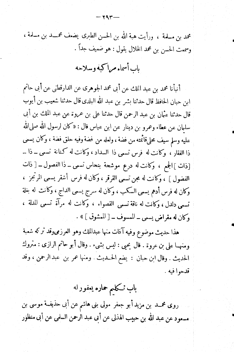 بَاب أَسمَاء مراكبه وسلاحه أَنبأَنَا مُحَمَّد بن عبد الملك عَن أبي مُحَمَّد الْجَوْهَرِي عَن الدَّارَقُطْنِيّ عَن أَبى حَاتِم ابْن حَبَّانَ الْحَافِظِ قَالَ حَدَّثَنَا بِشْرُ بن عبد الله الْبَلَدِيُّ قَالَ حَدَّثَنَا شُعَيْبُ بْنُ أَيُّوبَ قَالَ حَدَّثَنَا عُثْمَانُ بْنُ عبد الرحمن قَالَ حَدَّثَنَا عَلِيُّ بْنُ عُرْوَةَ عَن عبد الملك بْنِ أَبِي سُلَيْمَانَ عَنْ عَطَاءٍ وَعَمْرِو بْنِ دِينَارٍ عَنْ ابْنِ عَبَّاسٍ قَالَ: " كَانَ لِرَسُولِ اللَّهِ صَلَّى اللَّهُ عَلَيْهِ وَسَلَّمَ سَيْفٌ مُحَلَّى قَائِمَتُهُ مِنْ فِضَّةٍ، وَلَعَلَّهُ مِنْ فِضَّةٍ وَفِيهِ حِلَقٌ فِضَّةٌ، وَكَانَ يُسَمَّى ذَا الْفَقَارِ، وَكَانَتْ لَهُ فَرَسٌ تُسَمَّى ذَا السَّدَادِ، وَكَانَت لَهُ كنَانَة تسمى ذَا [ذَاتَ] الْجَمْعِ، وَكَانَتْ لَهُ دِرْعٌ موشحة بنحاس تسمى ذَا الْفُصُول [ذَاتَ الْفُضُولِ] ، وَكَانَتْ لَهُ مِجَنٌّ تُسَمَّى الْقَرْقَرَ، وَكَانَ لَهُ فَرَسٌ أَشْقَرُ يُسَمَّى الْمُرْتَجِزَ، وَكَانَ لَهُ فَرَسٌ أَدْهَمُ يُسَمَّى السَّكْبَ، وَكَانَ لَهُ سَرْجٌ يُسَمَّى الدَّاجَ، وَكَانَتْ لَهُ بَغْلَةٌ