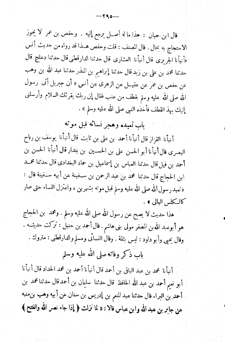 بَاب تعبده وهجر نِسَائِهِ قبل مَوته أَنْبَأَنَا الْقَزاز قَالَ أَنْبَأَنَا أَحْمد بن عَليّ بن ثَابت قَالَ أَنْبَأَنَا يُوسُفُ بْنُ رَبَاحٍ الْبَصْرِيُّ قَالَ أَنبأَنَا أَبُو الْحسن عَليّ بْنُ الْحُسَيْنِ بْنِ بُنْدَارٍ قَالَ أَنْبَأَنَا الْحَسَنُ بْنُ أَحْمَدَ بْنِ فِيلٍ قَالَ حَدَّثَنَا الْعَبَّاسُ بْنُ إِسْمَاعِيلَ بْنِ حَمَّادٍ الْبَغْدَادِيُّ قَالَ حَدثنَا مُحَمَّد