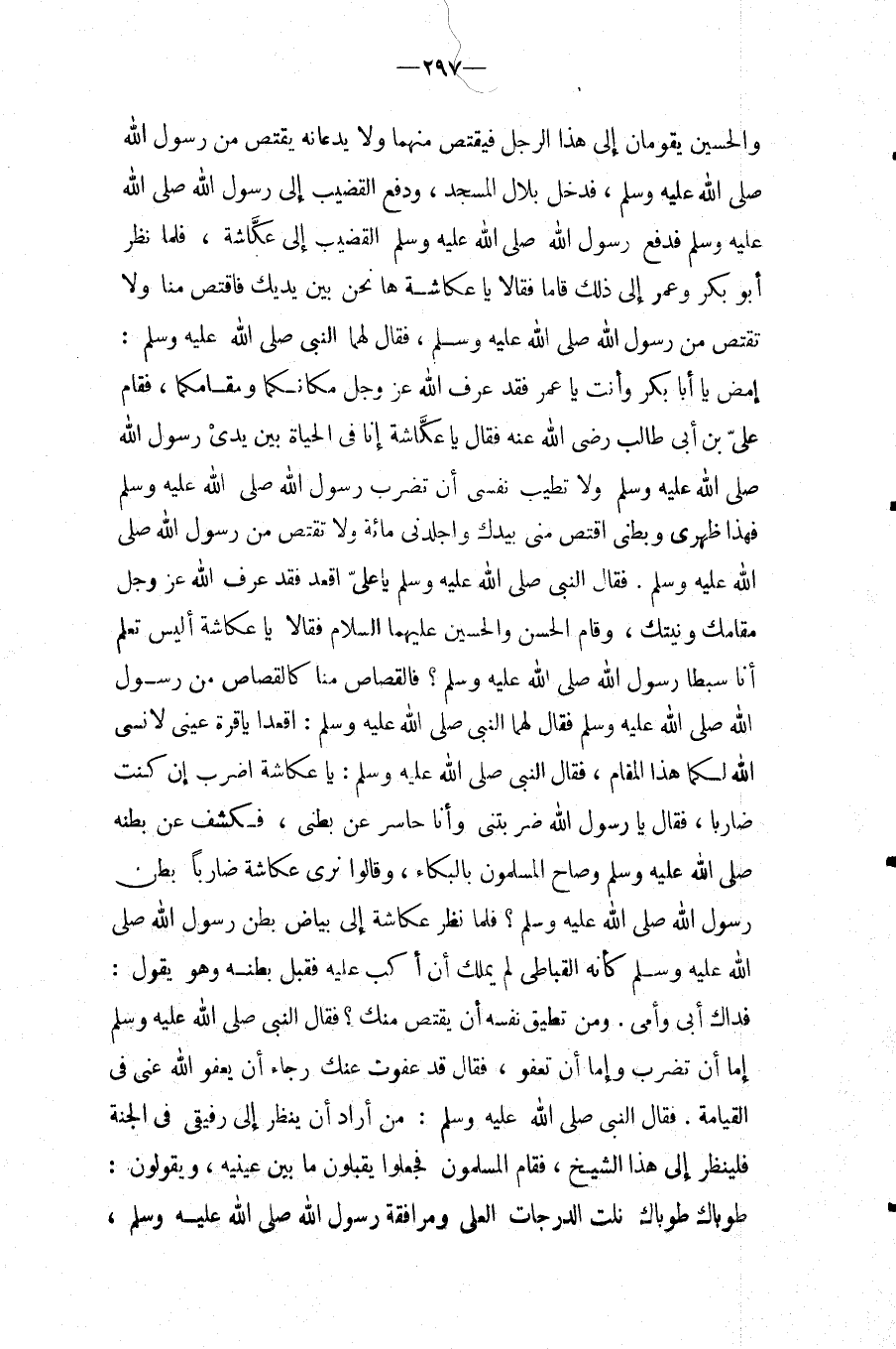 وَالْحُسَيْنِ يَقُومَانِ إِلَى هَذَا الرَّجُلِ فَيَقْتَصُّ مِنْهُمَا وَلا يَدَعَانَهُ يَقْتَصُّ مِنْ رَسُولِ اللَّهِ صَلَّى اللَّهُ عَلَيْهِ وَسَلَّمَ، فَدَخَلَ بِلالٌ الْمَسْجِدَ، وَدَفَعَ الْقَضِيبَ إِلَى رَسُولِ اللَّهِ صَلَّى اللَّهُ عَلَيْهِ وَسَلَّمَ فَدَفَعَ رَسُول الله " صَلَّى اللَّهُ عَلَيْهِ وَسَلَّمَ الْقَضِيبَ إِلَى عُكَاشَةَ، فَلَمَّا نَظَرَ أَبُو بَكْرٍ وَعُمَرُ إِلَى ذَلِكَ قَامَا فَقَالَا يَا عُكَاشَةَ هَا نَحْنُ بَيْنَ يَدَيْكَ فَاقْتَصَّ مِنَّا وَلا تَقْتَصَّ مِنْ رَسُولِ الله صَلَّى اللَّهُ عَلَيْهِ وَسَلَّمَ، فَقَالَ لَهُمَا النَّبِيُّ صَلَّى اللَّهُ عَلَيْهِ وَسَلَّمَ: امْضِ يَا أَبَا بَكْرٍ وَأَنْتَ يَا عُمَرُ فَقَدْ عرف الله عزوجل مَكَانَكُمَا وَمَقَامَكُمَا، فَقَامَ عَلِيُّ بْنُ أبي طَالب رَضِي الله عَنهُ فَقَالَ يَا عُكَاشَةَ إِنَّا فِي الْحَيَاةِ بَيْنَ يَدَيْ رَسُولِ اللَّهِ صَلَّى اللَّهُ عَلَيْهِ وَسَلَّمَ وَلا تَطِيبُ نَفْسِي أَنْ تَضْرِبَ رَسُولَ الله صَلَّى اللَّهُ عَلَيْهِ وَسَلَّمَ