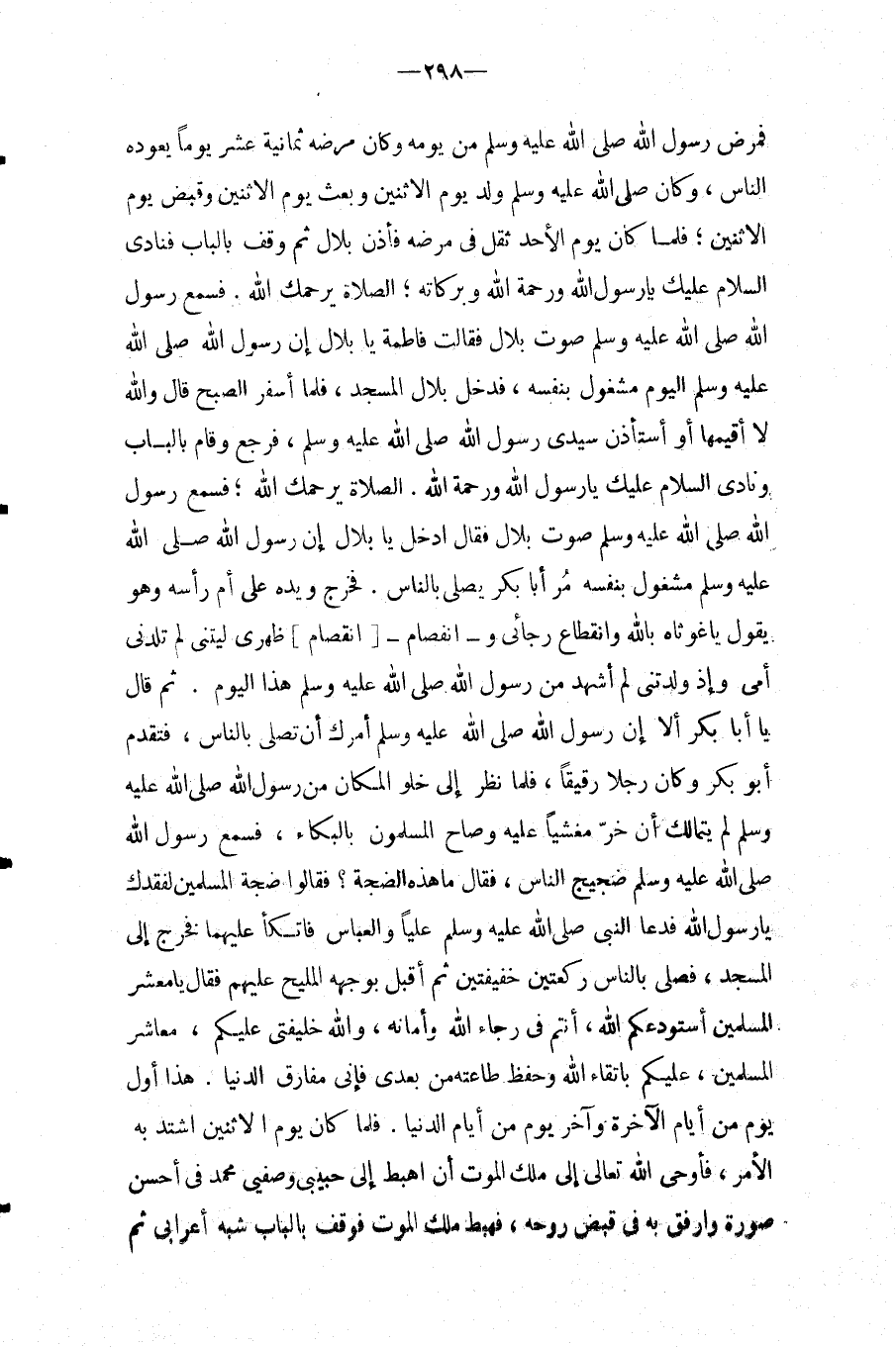 ثُمَّ قَالَ يَا أَبَا بَكْرٍ أَلا أَن رَسُول الله صَلَّى اللَّهُ عَلَيْهِ وَسَلَّمَ أَمَرَكَ أَنْ تُصَلِّي بِالنَّاسِ، فَتَقَدَّمَ أَبُو بَكْرٍ وَكَانَ رَجُلا رَقِيقًا، فَلَمَّا نَظَرَ إِلَى خُلُوِّ الْمَكَانِ مِنْ رَسُولِ اللَّهِ صَلَّى اللَّهُ عَلَيْهِ وَسَلَّمَ لَمْ يَتَمَالَكْ أَنْ خَرَّ مَغْشِيًّا عَلَيْهِ وَصَاحَ الْمُسْلِمِونَ بِالْبُكَاءِ، فَسَمِعَ رَسُولُ الله صَلَّى اللَّهُ عَلَيْهِ وَسَلَّمَ ضَجِيجَ النَّاسِ، فَقَالَ مَا هَذِهِ الضَّجَّةُ؟ فَقَالُوا ضَجَّةُ الْمُسْلِمِينَ لِفَقْدِكَ يَا رَسُولَ اللَّهِ فَدَعَا النَّبِيُّ صَلَّى اللَّهُ عَلَيْهِ وَسَلَّمَ عَلِيًّا وَالْعَبَّاسَ فَاتَّكَأَ عَلَيْهِمَا فَخَرَجَ إِلَى الْمَسْجِدِ، فَصَلَّى بِالنَّاسِ رَكْعَتَيْنِ خَفِيفَتَيْنِ ثُمَّ أَقْبَلَ بِوَجْهِهِ الْمَلِيحُ عَلَيْهِمْ فَقَالَ يَا مَعْشَرَ الْمُسْلِمِينَ أَسْتَوْدِعُكُمُ اللَّهُ، أَنْتُمْ فِي رَجَاءِ اللَّهِ وَأَمَانِهِ، وَاللَّهُ خَلِيفَتِي عَلَيْكُمْ، مَعَاشِرَ الْمُسْلِمِينَ، عَلَيْكُمْ بِاتِّقَاءِ اللَّهِ وحَفْظِ طَاعَتِهِ مِنْ بَعْدِي فَإِنِّي مُفَارِقٌ الدُّنْيَا.
