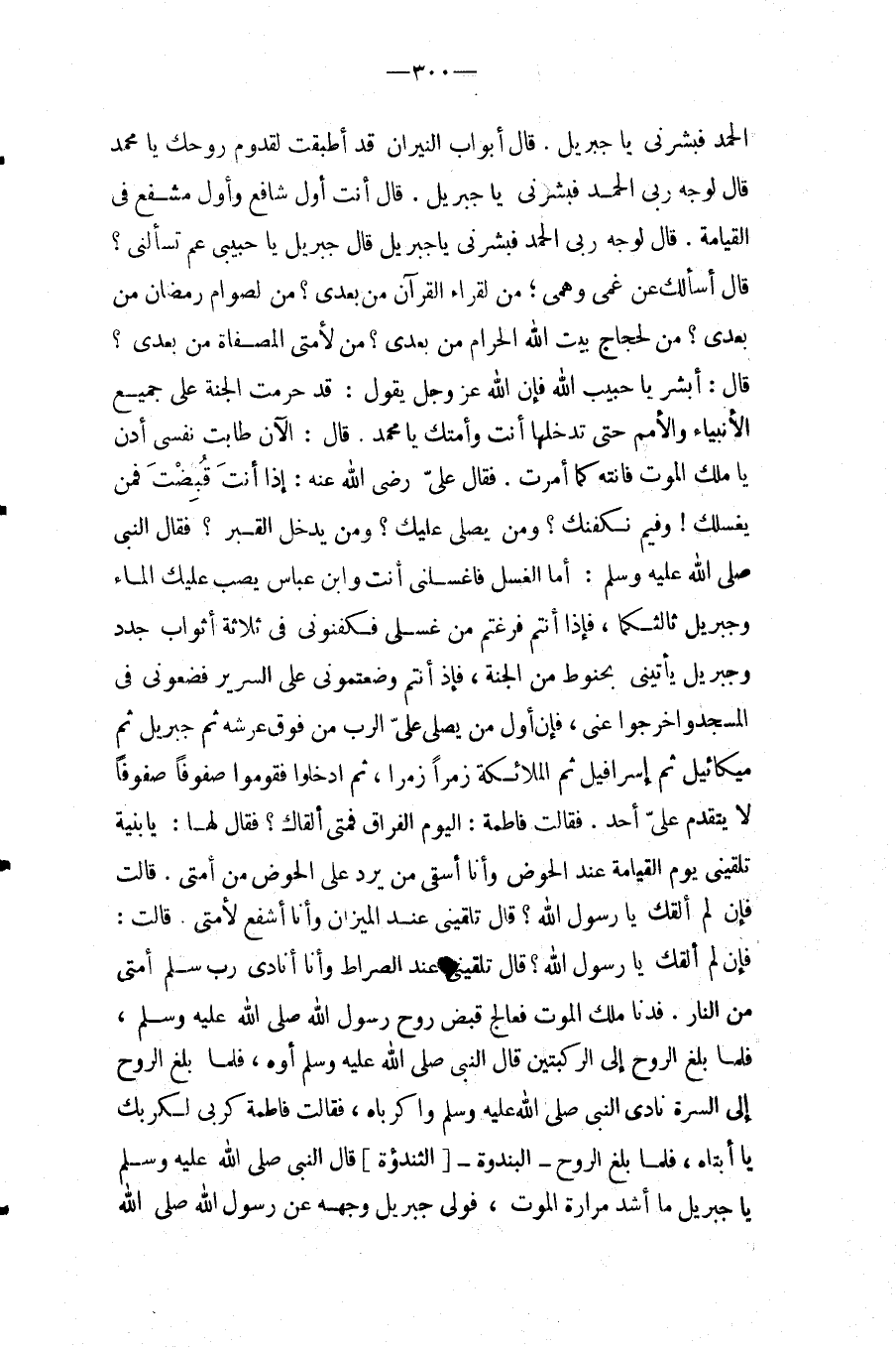 قَالَ لِوَجْهِ رَبِّي الْحَمْدَ فَبَشِّرْنِي يَا جِبْرِيلُ قَالَ جِبْرِيلُ يَا حَبِيبِي عَمَّ تَسْأَلُنِي؟ قَالَ أَسْأَلُكَ عَنْ غَمِّي وَهَمِّي، مَنْ لِقُرَّاءِ الْقُرْآنَ مِنْ بَعْدِي؟ مَنْ لِصُوَّامَ رَمَضَانَ مِنْ بَعْدِي؟ مَنْ لِحُجَّاجِ بَيْتِ اللَّهِ الْحَرَامِ مِنْ بَعْدِي؟ مَنْ لأُمَّتِي الْمُصَفَّاةِ مِنْ بَعْدِي؟ قَالَ: أَبْشِرْ يَا حَبِيبَ اللَّهِ فَإِنَّ اللَّهَ عزوجل يَقُولُ: قَدْ حُرِّمَتِ الْجَنَّةُ عَلَى جَمِيعِ الأَنْبِيَاءِ وَالأُمَمِ حَتَّى تَدْخُلَهَا أَنْتَ وَأُمَّتُكَ يَا مُحَمَّدُ.