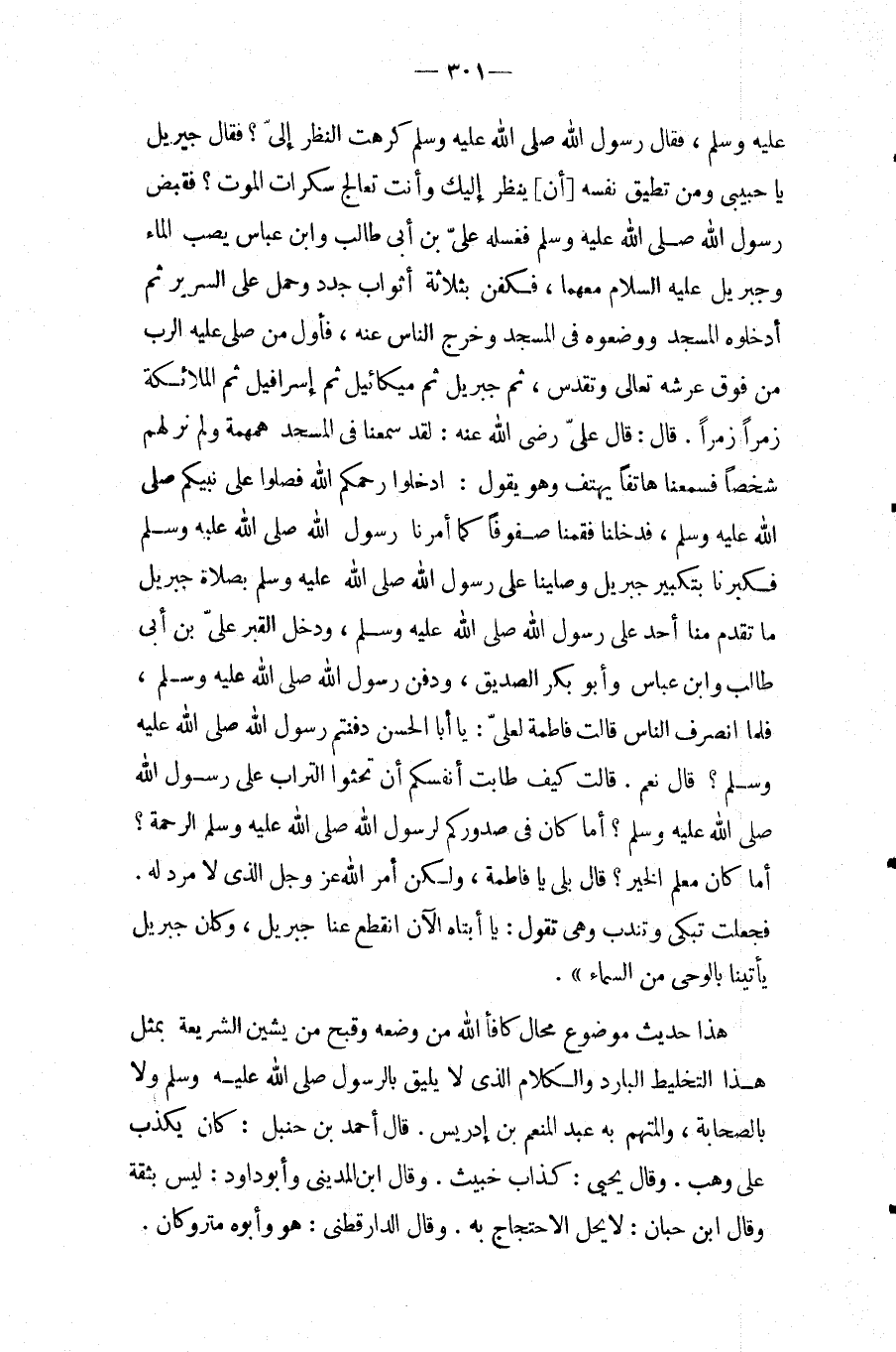 عَلَيْهِ وَسَلَّمَ، فَقَالَ رَسُولُ اللَّهِ صَلَّى اللَّهُ عَلَيْهِ وَسَلَّمَ كَرِهْتَ النّظر إِلَى؟ فَقَالَ جيريل يَا حَبِيبِي وَمَنْ تَطِيقُ نَفْسَهُ [أَنْ] يَنْظُرَ إِلَيْكَ وَأَنْتَ تُعَالِجُ سَكَرَاتَ الْمَوْتِ؟ فَقُبِضَ رَسُولُ اللَّهِ صَلَّى اللَّهُ عَلَيْهِ وَسَلَّمَ فَغَسَّلَهُ عَلِيُّ بْنُ أَبِي طَالِبٍ وَابْنُ عَبَّاسٍ يَصُبُّ الْمَاءَ وَجِبْرُيلُ عَلَيْهِ السَّلامُ مَعَهُمَا، فَكُفِّنَ بِثَلاثَةِ أَثْوَابٍ جُدُدٍ وَحُمِلَ عَلَى السَّرِيرِ ثُمَّ أَدْخَلُوهُ الْمَسْجِدَ وَوَضَعُوهُ فِي الْمَسْجِدِ وخَرَجَ النَّاسُ عَنْهُ، فَأَوَّلُ مَنْ صَلَّى عَلَيْهِ الرَّبُّ مِنْ فَوْقِ عَرْشِهِ تَعَالَى وَتَقَدَّسَ، ثُمَّ جِبْرِيلُ ثُمَّ مِيكَائِيلُ ثُمَّ إِسْرَافِيلُ ثُمَّ الْمَلائِكَةُ زُمَرًا زُمَرًا.