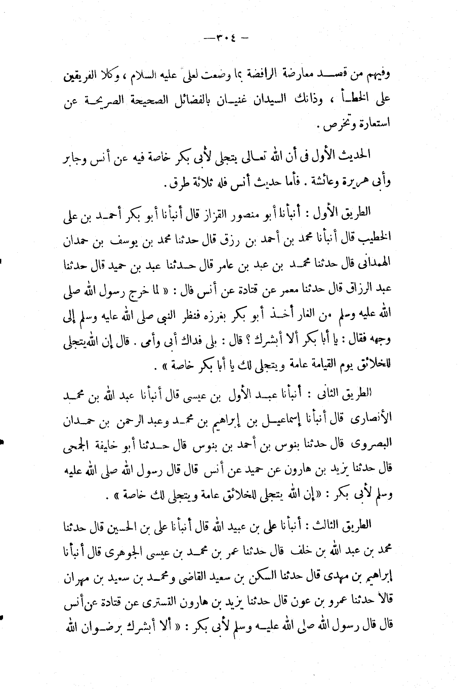 الطريقي الثَّانِي: أَنْبَأَنَا عَبْدُ الأَوَّلِ بْنُ عِيسَى قَالَ أَنبأَنَا عبد الله بن مُحَمَّد الْأنْصَارِيّ قَالَ أَنبأَنَا إِسْمَاعِيلُ بْنُ إِبْرَاهِيمَ بْنِ مُحَمَّدٍ وَعَبْدُ الرَّحْمَنِ بْنُ حَمْدَانَ الْبَصْرَوِيُّ قَالَ حَدَّثَنَا بُنَوْسُ بْنُ أَحْمَدَ بْنِ بُنَوْسٍ قَالَ حَدَّثَنَا أَبُو خَلِيفَةَ الْجُمَحِيُّ قَالَ حَدَّثَنَا يَزِيدُ بْنُ هَارُونَ عَنْ حُمَيْدٍ عَنْ أَنْسٍ قَالَ قَالَ رَسُولُ اللَّهِ صَلَّى اللَّهُ عَلَيْهِ وَسَلَّمَ لأَبِي بَكْرٍ: " إِنَّ اللَّهَ يَتَجَلَّى لِلْخَلائِقِ عَامَّةً وَيَتَجَلَّي لَكَ خَاصَّةً ".