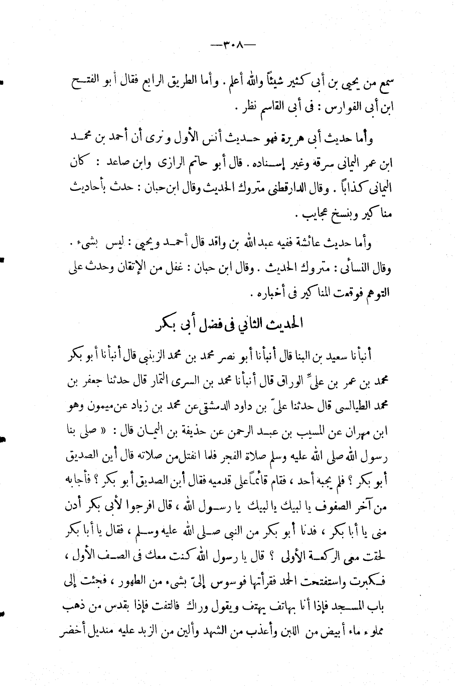مُحَمَّدِ بْنِ عُمَرَ بْنِ عَلِيٍّ الْوَرَّاقُ قَالَ أَنْبَأَنَا مُحَمَّدُ بْنُ السَّرِيِّ التَّمَّارُ قَالَ حَدَّثَنَا جَعْفَرُ بْنُ مُحَمَّدٍ الطَّيَالِسِيُّ قَالَ حَدَّثَنَا عَلِيُّ بْنُ دَاوُدَ الدِّمَشْقِيُّ عَنْ مُحَمَّدِ بْنِ زِيَادٍ عَنْ مَيْمُونٍ وَهُو ابْنُ مَهْرَانَ عَنِ الْمُسَيَّبِ بن عبد الرحمن عَنْ حُذَيْفَةَ بْنِ الْيَمَانِ قَالَ: " صَلَّى بِنَا رَسُولُ اللَّهِ صَلَّى اللَّهُ عَلَيْهِ وَسَلَّمَ صَلاةَ الْفَجْرِ فَلَمَّا انْفَتَلَ مِنْ صَلاتِهِ قَالَ أَيْنَ الصِّدِّيقُ أَبُو بَكْرٍ؟ فَلَمْ يُجِبْهُ أَحَدٌ، فَقَامَ قَائِمًا عَلَى قَدَمَيْهِ فَقَالَ أَيْنَ الصِّدِّيقُ أَبُو بَكْرٍ؟ فَأَجَابَهُ مِنْ آخِرِ الصُّفُوفِ يَا لَبَّيْكَ يَا لَبَّيْكَ يَا رَسُولَ اللَّهِ، قَالَ افْرِجُوا لأَبِي بَكْرٍ ادْنُ مِنِّي يَا أَبَا بَكْرٍ، فَدَنَا أَبُو بَكْرٍ مِنَ النَّبِي صَلَّى اللَّهُ عَلَيْهِ وَسَلَّمَ، فَقَالَ يَا أَبَا بَكْرٍ لَحِقْتَ مَعِي الرَّكْعَةَ الأُولَى؟ قَالَ يَا رَسُولَ اللَّهِ كُنْتُ مَعَكَ فِي الصَّفِّ الأَوَّلِ، فَكَبَّرْتُ وَاسْتَفْتَحْتُ الْحَمْدَ فقرأتها فوسوس إِلَى بشئ مِنَ الطَّهُورِ، فَجِئْتُ إِلَى بَابِ الْمَسْجِدِ فَإِذَا أَنَا بِهَاتِفٍ يَهْتِفُ وَيَقُول وَرَاك فَالْتَفت فَإِذا بقدس مِنْ ذَهَبٍ مَمْلُوءٍ مَاءً أَبْيَضَ مِنَ اللَّبَنِ وَأَعْذَبَ مِنَ الشَّهْدِ وَأَبْيَنَ مِنَ الزُّبْدِ عَلَيْهِ مِنْدِيلٌ أَخْضَر