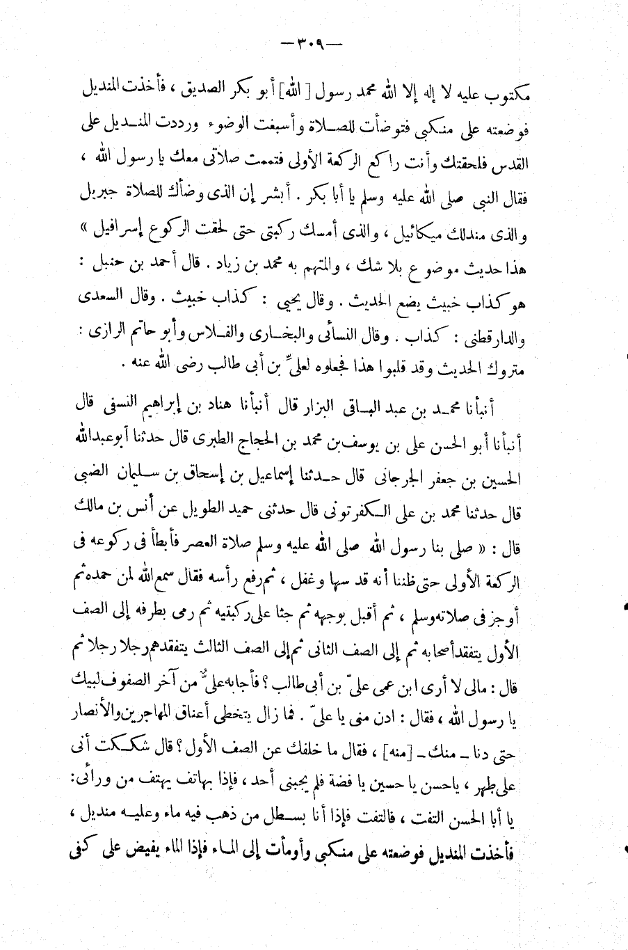 أَبْشِرْ إِنَّ الَّذِي وَضَّأَكَ لِلصَّلاةِ جِبْرِيلُ وَالَّذِي مَنْدَلَكَ مِيكَائِيلُ، وَالَّذِي أَمْسَكَ رُكْبَتَيْ حَتَّى لَحِقْتَ الرُّكُوعَ إِسْرَافِيلُ " هَذَا حَدِيث مَوْضُوع بِلَا شكّ، وَالْمُتَّهَم بِهِ مُحَمَّد بن زِيَاد.