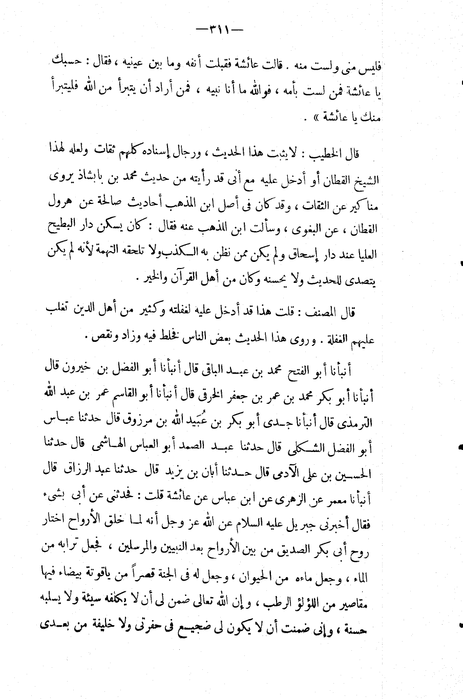 أَنبأَنَا أَبُو الْفَتْح مُحَمَّد بن عَبْدِ الْبَاقِي قَالَ أَنْبَأَنَا أَبُو الْفَضْلِ بْنُ خَيْرُونٍ قَالَ أَنْبَأَنَا أَبُو بَكْرٍ مُحَمَّدُ بْنُ عُمَرَ بْنِ جَعْفَرٍ الْخِرَقِيُّ قَالَ أَنْبَأَنَا أَبُو الْقَاسِم عمر بن عبد الله التِّرْمِذِيُّ قَالَ أَنْبَأَنَا جَدِّي أَبُو بكر بن عبيد الله بْنِ مَرْزُوقٍ قَالَ حَدَّثَنَا عَبَّاسُ أَبُو الْفَضْلِ الشِّكْلِيُّ قَالَ حَدَّثَنَا عَبْدُ الصَّمَدِ أَبُو الْعَبَّاسِ الْهَاشِمِيُّ قَالَ حَدَّثَنَا الْحُسَيْنُ بْنُ عَلِيِّ الآدَمِيُّ قَالَ حَدَّثَنَا أَبَانُ بْنُ يَزِيدَ قَالَ حَدَّثَنَا عَبْدُ الرَّزَّاقِ قَالَ أَنْبَأَنَا مَعْمَرٌ عَنِ الزُّهْرِيِّ عَنِ ابْنِ عَبَّاسٍ عَنْ عَائِشَةَ قلت: فَحَدثني عَن أَبى بشئ فَقَالَ أَخْبَرَنِي جِبْرِيلُ عَلَيْهِ السَّلامُ عَن الله عزوجل أَنَّهُ لَمَّا خَلَقَ الأَرْوَاحَ اخْتَارَ رُوحَ أَبِي بَكْرٍ الصِّدِّيقَ مِنْ بَيْنِ الأَرْوَاحِ بَعْدَ النَّبِيِّينَ وَالْمُرْسَلِينَ، فَجَعَلَ تُرَابَهُ مِنَ الْمَاءِ، وَجَعَلَ مَاءَهُ مِنَ الْحَيَوَانِ، وَجَعَلَ لَهُ فِي الْجَنَّةِ قَصْرًا مِنْ يَاقُوتَةٍ بَيْضَاءَ فِيهَا مَقَاصِيرُ مِنَ اللُّؤْلُؤِ الرَّطِبِ، وَإِنَّ اللَّهَ تَعَالَى ضَمِنَ لِي أَنْ لَا يُكَلِّفَهُ سَيِّئَةً وَلا يَسْلِبَهُ حَسَنَةً، وَإِنِّي ضَمِنْتُ أَنْ لَا يَكُونَ لِي ضَجِيعٌ فِي حُفْرَتِي وَلا خَلِيفَةٌ مِنْ بعدى