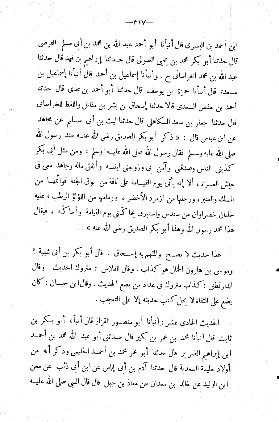 وَأَنْبَأَنَا إِسْمَاعِيل بن أَحْمد قَالَ أَنبأَنَا إِسْمَاعِيلُ بْنُ مَسْعَدَةَ قَالَ أَنْبَأَنَا حَمْزَةُ بْنُ يُوسُفَ قَالَ حَدَّثَنَا أَبُو أَحْمد بن عدي قَالَ حَدَّثَنَا أَحْمَدُ بْنُ حَفْصٍ السَّعْدِيُّ قَالا حَدَّثَنَا إِسْحَاقُ بْنُ بِشْرِ بْنِ مُقَاتِلٍ وَاللَّفْظُ لِلْخُرَاسَانِيِّ قَالَ حَدَّثَنَا جَعْفَرُ بْنُ سَعْدٍ الْكَاهِلِيُّ قَالَ حَدَّثَنَا لَيْثُ بْنُ أَبِي سُلَيْمٍ عَنْ مُجَاهِدٍ عَنِ ابْنِ عَبَّاسٍ قَالَ: " ذُكِرَ أَبُو بَكْرٍ الصِّدِّيقُ رَضِيَ اللَّهُ عَنْهُ عِنْدَ رَسُول الله صَلَّى اللَّهُ عَلَيْهِ وَسَلَّمَ فَقَالَ رَسُولُ اللَّهِ صَلَّى اللَّهُ عَلَيْهِ وَسَلَّمَ: وَمَنْ مِثْلَ أَبِي بَكْرٍ كَذَّبَنِي النَّاسُ وَصَدَّقَنِي وَآمَنَ بِي وَزَوَّجَنِي ابْنَتَهُ وَأَنْفَقَ مَالَهُ وَجَاهَدَ مَعِيَ فِي جَيْشِ الْعُسْرَةِ، أَلا إِنَّهُ يَأْتِي يَوْمَ الْقِيَامَةِ عَلَى نَاقَةٍ مِنْ نُوقِ الْجَنَّةِ قَوَائِمُهَا مِنَ الْمِسْكِ وَالْعَنْبَرِ، وَرَحْلُهَا مِنَ الزُّمُرُّدِ الأَخْضَرِ، وَزِمَامُهَا مِنَ اللُّؤْلُؤِ الرَّطِبِ، عَلَيْهِ حُلَّتَانِ خَضْرَاوَانِ مِنْ سُنْدُسٍ وَإِسْتَبْرَقٍ يُحَاكِنِي يَوْمَ الْقِيَامَةِ وَأُحَاكِهِ، فَيُقَالُ هَذَا مُحَمَّدٌ رَسُولُ اللَّهِ وَهَذَا أَبُو بكر الصّديق رَضِي الله عَنهُ ".