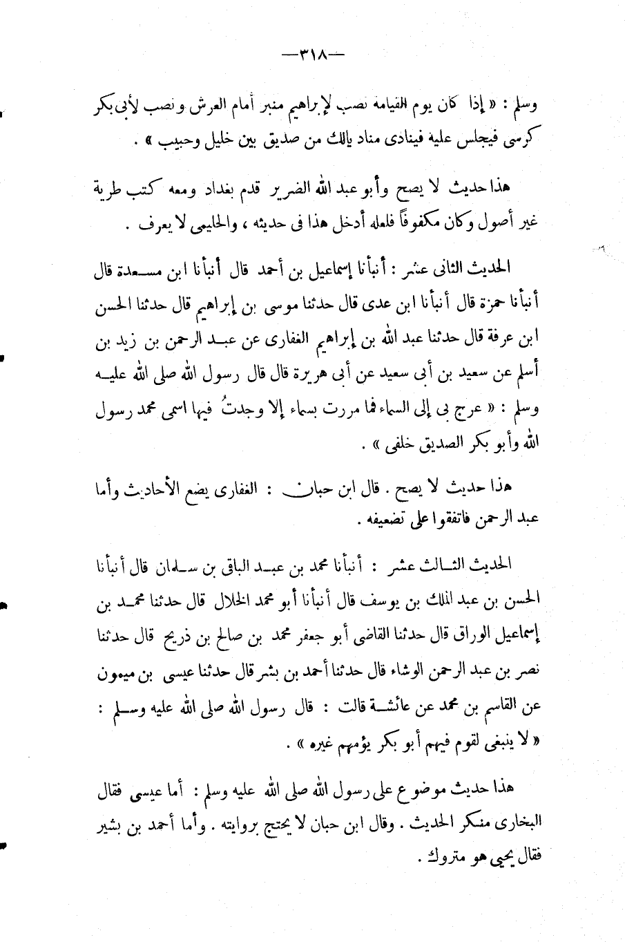 الحَدِيث الثَّالِث عشر: أَنْبَأَنَا مُحَمَّدُ بْنُ عَبْدِ الْبَاقِي بْنِ سَلْمَانَ قَالَ أَنبأَنَا الْحسن بن عبد الملك بْنُ يُوسُفَ قَالَ أَنْبَأَنَا أَبُو مُحَمَّدٍ الْخَلالُ قَالَ حَدَّثَنَا مُحَمَّدُ بْنُ إِسْمَاعِيلَ الْوَرَّاقُ قَالَ حَدَّثَنَا الْقَاضِي أَبُو جَعْفَرٍ مُحَمَّدُ بْنُ صَالِحِ بْنِ ذُرَيْحٍ قَالَ حَدَّثَنَا نصر بن عبد الرحمن الْوَشَّاءُ قَالَ حَدَّثَنَا أَحْمَدُ بْنُ بِشْرٍ قَالَ حَدَّثَنَا عِيسَى بْنُ مَيْمُونٍ عَنِ الْقَاسِمِ بْنِ مُحَمَّدٍ عَنْ عَائِشَةَ قَالَتْ: قَالَ رَسُولُ الله صَلَّى اللَّهُ عَلَيْهِ وَسَلَّمَ: " لَا يَنْبَغِي لِقَوْمِ فِيهِمْ أَبُو بَكْرٍ يَؤُمُّهُمْ غَيْرُهُ ".