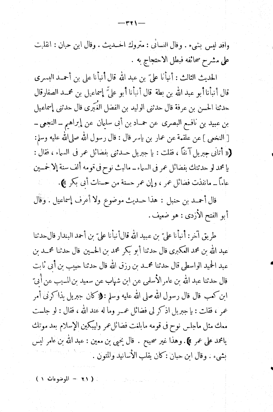 الحَدِيث الثَّالِث: أَنبأَنَا على بن عبد الله قَالَ أَنْبَأَنَا عَلِيُّ بْنُ أَحْمَدَ الْبُسْرِيِّ قَالَ أَنْبَأَنَا أَبُو عَبْدِ اللَّهِ بْنِ بَطَّةَ قَالَ أَنْبَأَنَا أَبُو عَلِيٍّ إِسْمَاعِيلُ بْنُ مُحَمَّدٍ الصَّفَّارُ قَالَ حَدَّثَنَا الْحَسَنُ بْنُ عَرَفَةَ قَالَ حَدَّثَنِي الْوَلِيدُ بْنُ الْفَضْلِ الْغُبَرِيُّ قَالَ حَدَّثَنِي إِسْمَاعِيلُ بْنُ عُبَيْدِ بْنِ نَافِعٍ الْبَصْرِيُّ عَنْ حَمَّادِ بْنِ أَبِي سُلَيْمَانَ عَن إِبْرَاهِيم - النجعى [النَّخَعِيُّ] عَنْ عَلْقَمَةَ عَنْ عَمَّارِ بْنِ يَاسِرٍ قَالَ: قَالَ رَسُولُ الله صَلَّى اللَّهُ عَلَيْهِ وَسَلَّمَ: " أَتَانِي جِبْرِيلُ آنِفًا، فَقُلْتُ: يَا جِبْرُيلُ حَدِّثْنِي بِفَضَائِلِ عُمَرَ فِي السَّمَاءِ، فَقَالَ: يَا مُحَمَّدُ لَوْ حَدَّثْتُكَ بِفَضَائِلِ عُمَرَ فِي السَّمَاءِ مَا لَبِثَ نُوحٌ فِي قَوْمِهِ أَلْفَ سَنَةٍ إِلا خَمْسِينَ عَامًا - مَا نَفِذَتْ فَضَائِلُ عُمَرَ، وَإِنَّ عُمَرَ حَسَنَةٌ مِنْ حَسَنَاتِ أَبِي بَكْرٍ ".
