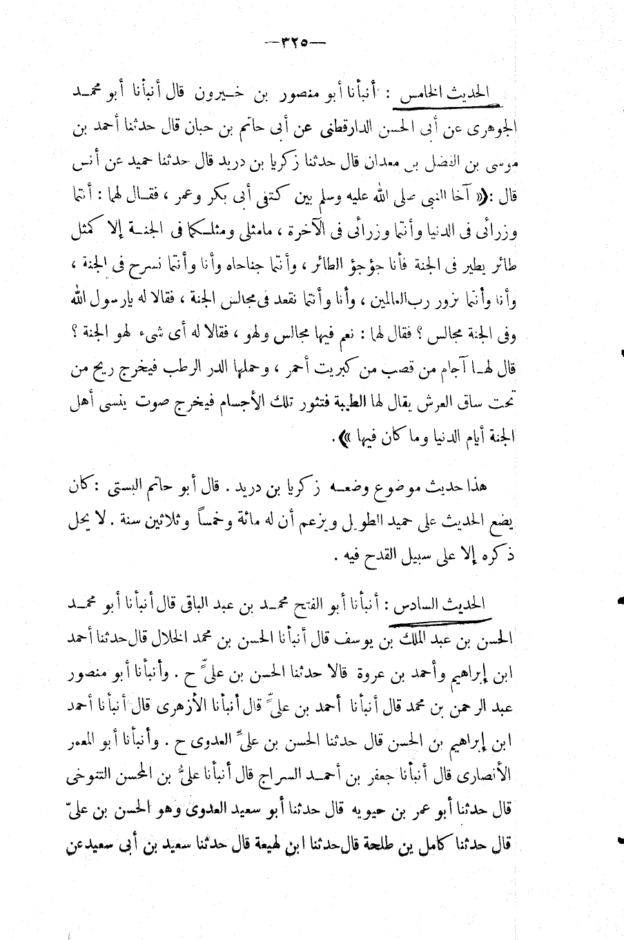 الحَدِيث الْخَامِس: أَنْبَأَنَا أَبُو مَنْصُورِ بْنُ خَيْرُونٍ قَالَ أَنْبَأَنَا أَبُو مُحَمَّدٍ الْجَوْهَرِيُّ عَنْ أَبِي الْحَسَنِ الدَّارَقُطْنِيِّ عَن أبي حَاتِم بن حبَان قَالَ حَدَّثَنَا أَحْمَدُ بْنُ مُوسَى بْنِ الْفَضْلِ بْنِ مَعْدَانَ قَالَ حَدَّثَنَا زَكَرِيَّا بْنُ دُرَيْدٍ قَالَ حَدَّثَنَا حُمَيْدٌ عَنْ أَنَسٍ قَالَ: " آخَا النَّبِيُّ صَلَّى اللَّهُ عَلَيْهِ وَسَلَّمَ بَيْنَ كَتِفَيْ أَبِي بَكْرٍ وَعُمَرَ، قَالَ لَهُمَا: أَنْتُمَا وُزُرَائِي فِي الدُّنْيَا وَأَنْتُمَا وُزَرَائِي فِي الْآخِرَة، مَا مثلى مثلكما فِي الْجَنَّةِ إِلا كَمَثَلِ طَائِرٍ يَطِيرُ فِي الْجَنَّةِ فَأَنَا جَؤْجُؤُ الطَّائِرِ، وَأَنْتُمَا جَنَاحَاهُ وَأَنَا وَأَنْتُمَا نَسْرَحُ فِي الْجَنَّةِ، وَأَنَا وَأَنْتُمَا نَزُورُ رَبَّ الْعَالَمِينَ، وَأَنَا وَأَنْتُمَا نَقْعُدُ فِي مَجَالِسِ الْجَنَّةِ، فَقَالا لَهُ يَا رَسُولَ اللَّهِ وَفِي الْجَنَّةِ مَجَالِسٌ؟ فَقَالَ لَهُمَا: نَعَمْ فِيهَا مَجَالِسٌ وَلَهْوٌ، فَقَالا لَهُ أَي شئ لَهْوُ الْجَنَّةِ؟ قَالَ لَهَا آجَامٌ مِنْ قَصَبٍ مِنْ كَبْرِيتٍ أَحْمَرَ، وَحَمْلُهَا الدُّرُّ الرَّطِبُ فَيَخْرُجُ رِيحٌ مِنْ تَحْتِ سَاقِ الْعَرْشِ يُقَالُ لَهَا الطَّيِّبَةُ فَتَثُورُ تِلْكَ الأَجْسَامُ فَيَخْرُجُ صَوْتٌ يُنْسِي أَهْلَ الْجَنَّةِ أَيَّامَ الدُّنْيَا وَمَا كَانَ فِيهَا ".
