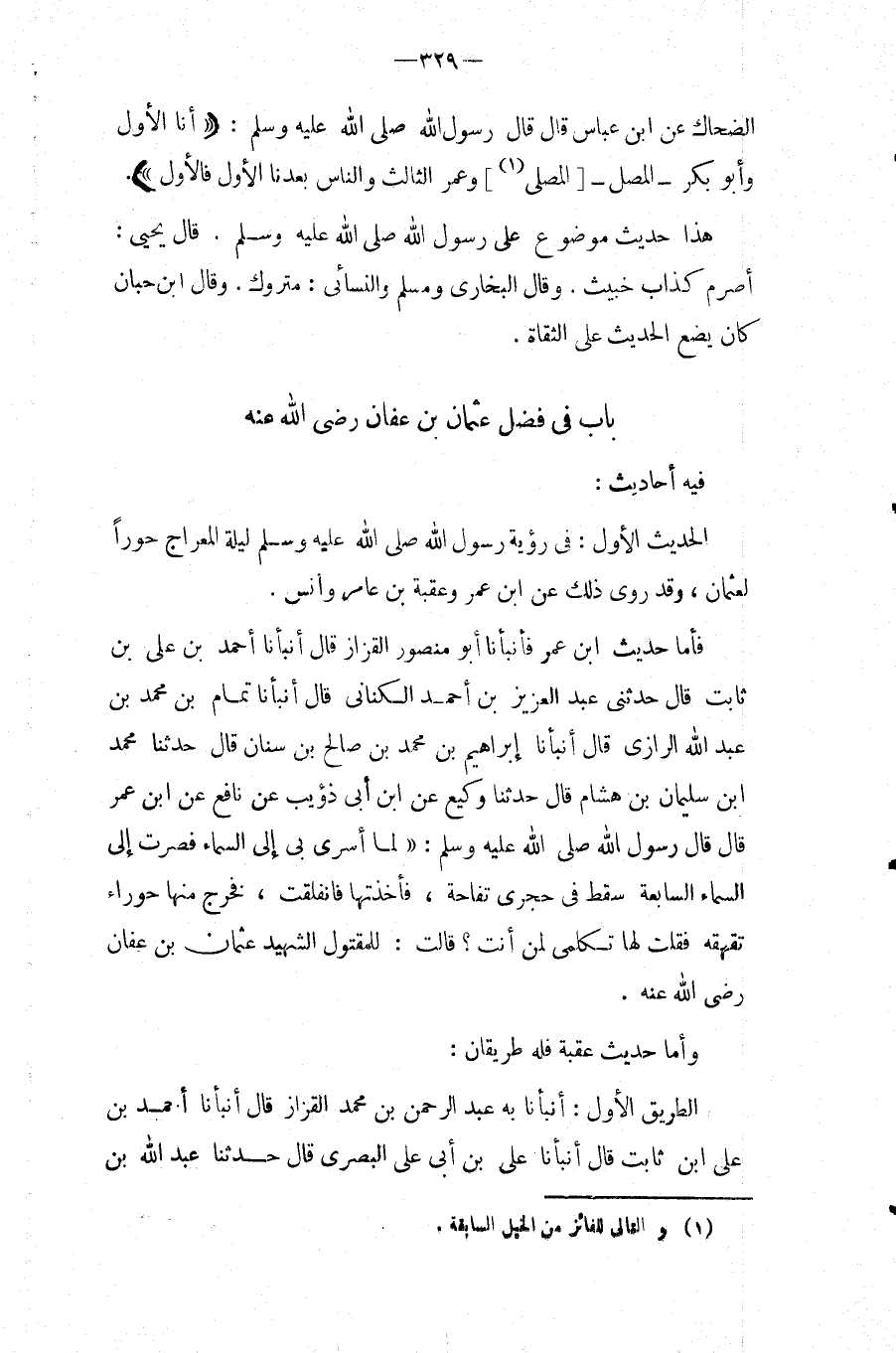 بَاب فِي فضان عُثْمَانُ بْنُ عَفَّانَ رَضِيَ اللَّهُ عَنهُ فِيهِ أَحَادِيث: الحَدِيث الأول: فِي رُؤْيَة رَسُول اللَّهِ صَلَّى اللَّهُ عَلَيْهِ وَسَلَّمَ لَيْلَة الْمِعْرَاج حورا لعُثْمَان، وَقد روى ذَلِك عَن ابْن عمر وَعقبَة بن عَامر وَأنس.