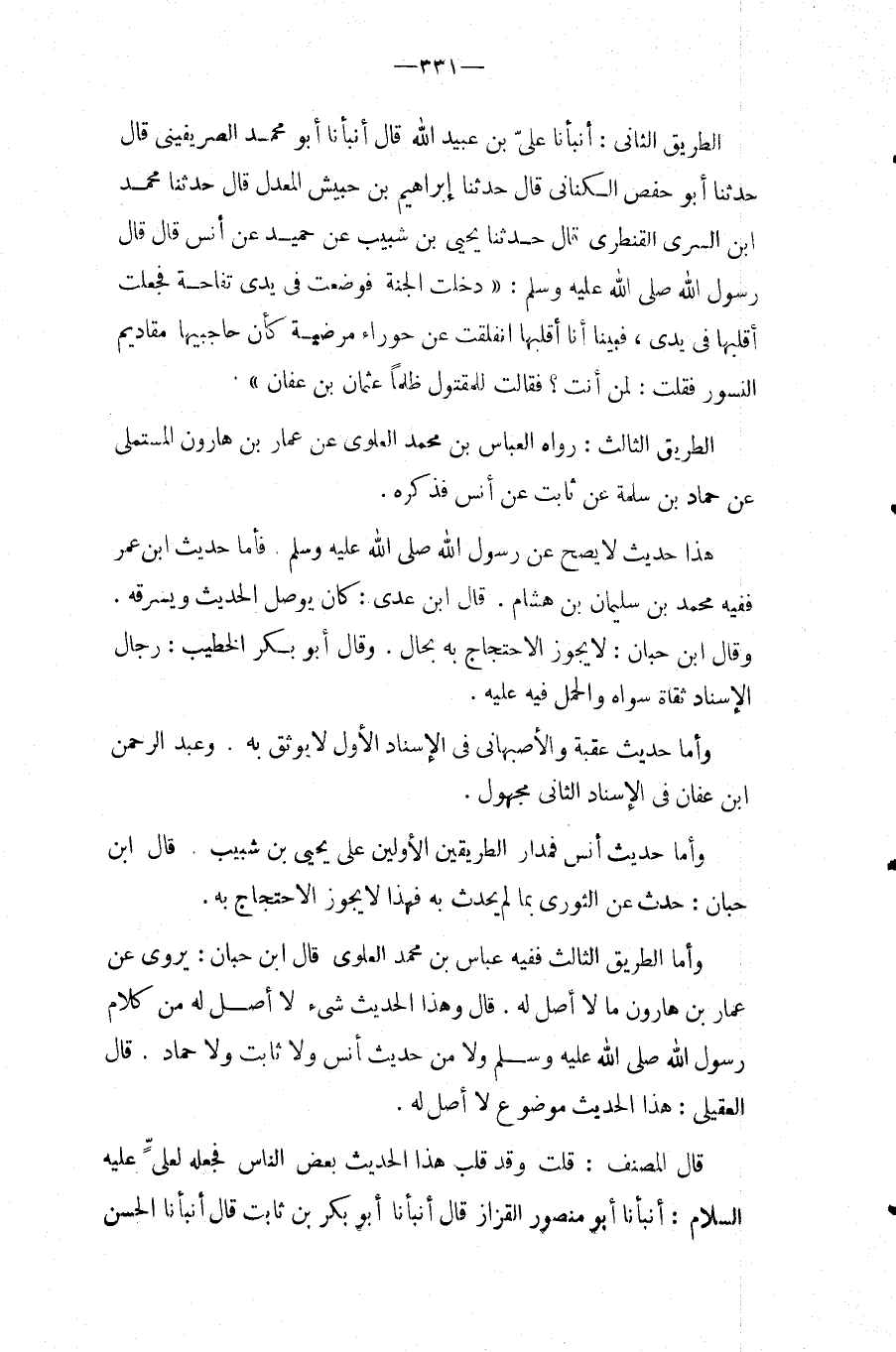 الطَّرِيق الثَّانِي: أَنْبَأَنَا عَلِيُّ بْنُ عبيد الله قَالَ أَنْبَأَنَا أَبُو مُحَمَّدٍ الصَّرِيفِينِيُّ قَالَ حَدَّثَنَا أَبُو حَفْصٍ الْكِنَانِيُّ قَالَ حَدَّثَنَا إِبْرَاهِيمُ بْنُ حُبَيْشٍ الْمعدل قَالَ حَدثنَا مُحَمَّد ابْن السَّرِيِّ الْقَنْطَرِيُّ قَالَ حَدَّثَنَا يَحْيَى بْنُ شُبَيْبٍ عَنْ حُمَيْدٍ عَنْ أَنْسٍ قَالَ قَالَ رَسُولُ اللَّهِ صَلَّى اللَّهُ عَلَيْهِ وَسَلَّمَ: " دَخَلْتُ الْجَنَّةَ فَوُضِعَتْ فِي يَدِي تُفَّاحَةٌ فَجَعَلْتُ أُقَلِّبُهَا فِي يَدِي، فَبَيْنَا أَنَا أُقَلِّبُهَا انْفَلَقَتْ عَنْ حَوْرَاءَ مَرْضِيَةٍ كَأَنَّ حَاجِبَيْهَا مَقَادِيمُ النُّسُورِ فَقُلْتُ: لِمَنْ أَنْتِ؟ فَقَالَتْ لِلْمَقْتُولِ ظُلْمًا عُثْمَانَ بْنِ عَفَّانَ ".