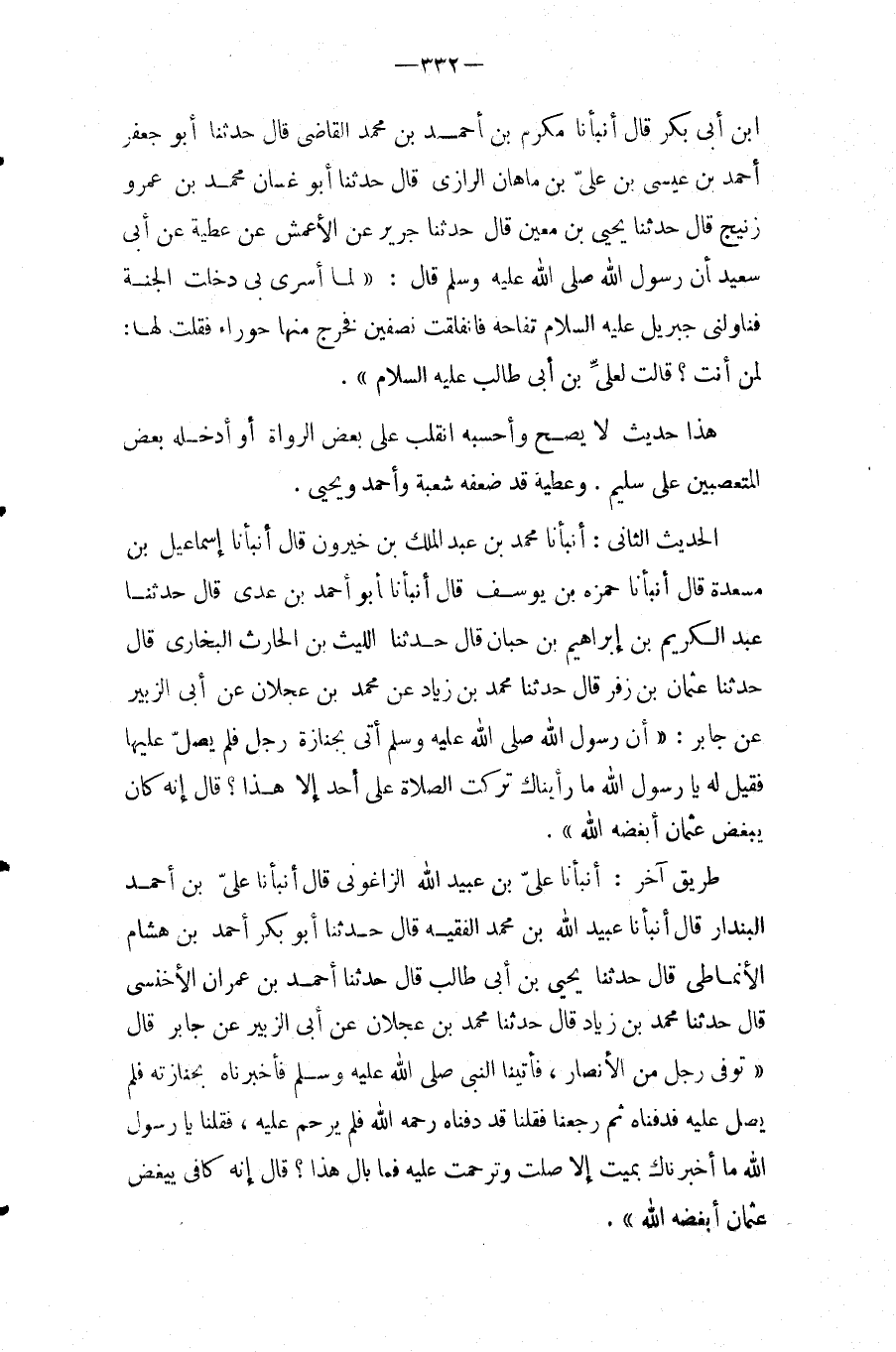 الحَدِيث الثَّانِي: أَنْبَأَنَا مُحَمَّدُ بْنُ عبد الملك بْنِ خَيْرُونٍ قَالَ أَنْبَأَنَا إِسْمَاعِيلُ بْنُ مَسْعَدَةَ قَالَ أَنْبَأَنَا حَمْزَةُ بْنُ يُوسُفَ قَالَ أَنْبَأَنَا أَبُو أَحْمَدَ بْنِ عَدِيٍّ قَالَ حَدَّثَنَا عَبْدُ الْكَرِيمِ بْنُ إِبْرَاهِيمَ بْنِ حَبَّانَ قَالَ حَدَّثَنَا اللَّيْثُ بْنُ الْحَارِثِ الْبُخَارِيُّ قَالَ حَدَّثَنَا عُثْمَانُ بْنُ زُفَرٍ قَالَ حَدَّثَنَا مُحَمَّدُ بْنِ زِيَادٍ عَنْ مُحَمَّدِ بْنِ عِجْلانَ عَنْ أَبِي الزُّبَيْرِ عَنْ جَابِرٍ: " أَنَّ رَسُولَ اللَّهِ صَلَّى اللَّهُ عَلَيْهِ وَسَلَّمَ أُتِيَ بِجَنَازَةِ رَجُلٍ فَلَمْ يُصَلِّ عَلَيْهَا فَقِيلَ لَهُ يَا رَسُولَ اللَّهِ مَا رَأَيْنَاكَ تَرَكْتَ الصَّلاةَ عَلَى أَحَدٍ إِلا هَذَا؟ قَالَ إِنَّهُ كَانَ يَبْغَضُ عُثْمَانَ أَبْغَضَهُ اللَّهُ ".