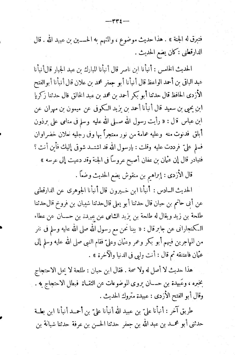 الحَدِيث السَّادِس: أَنْبَأَنَا ابْنُ خَيْرُونٍ قَالَ أَنْبَأَنَا الْجَوْهَرِيُّ عَنِ الدَّارَقُطْنِيِّ عَنْ أَبِي حَاتِمِ بْنِ حِبَّانَ قَالَ حَدَّثَنَا أَبُو يَعْلَى قَالَ حَدَّثَنَا شَيْبَانُ بْنُ فَرُّوخَ قَالَ حَدَّثَنَا طَلْحَةُ بْنُ زَيْدٍ وَيُقَالُ لَهُ طَلْحَةُ بْنُ يَزِيدَ الشَّامِيُّ عَنْ عُبَيْدَةَ بْنِ حَسَّانٍ عَنْ عَطَاءٍ الكنجارانى عَنْ جَابِرٍ قَالَ: " بَيْنَا نَحْنُ مَعَ رَسُولِ اللَّهِ صَلَّى اللَّهُ عَلَيْهِ وَسَلَّمَ فِي نَفَرٍ مِنَ الْمُهَاجِرِينَ فِيهِمْ أَبُو بَكْرٍ وَعُمَرُ وَعُثْمَانُ وَعَلِيٌّ فَقَامَ النَّبِيُّ صَلَّى اللَّهُ عَلَيْهِ وَسَلَّمَ إِلَى عُثْمَانَ فَاعْتَنَقَهُ ثُمَّ قَالَ: أَنْتَ وَلِيِّي فِي الدُّنْيَا وَالآخِرَةِ ".