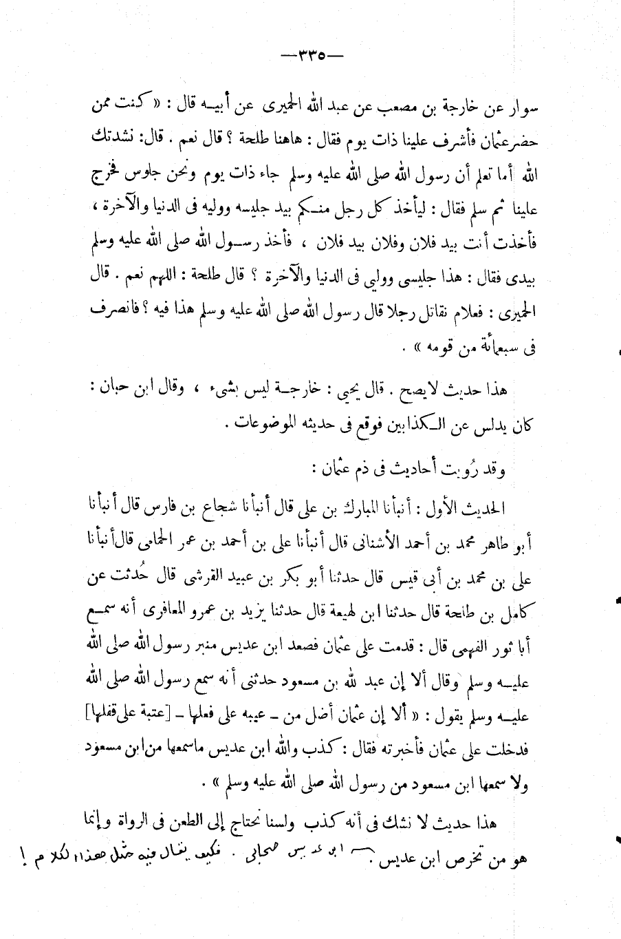 وَقد رويت أَحَادِيث فِي ذمّ عُثْمَان: الحَدِيث الأول: أَنْبَأَنَا الْمُبَارَكُ بْنُ عَلِيٍّ قَالَ أَنْبَأَنَا شُجَاعُ بْنُ فَارِسٍ قَالَ أَنْبَأَنَا أَبُو طَاهِرٍ مُحَمَّدُ بْنُ أَحْمَدَ الأُشْنَانِيُّ قَالَ أَنْبَأَنَا عَلِيُّ بْنُ أَحْمَدَ بْنِ عُمَرَ الْحَمَامِيُّ قَالَ أَنْبَأَنَا عَلِيُّ بْنُ مُحَمَّدِ بْنِ أَبِي قَيْسٍ قَالَ حَدَّثَنَا أَبُو بَكْرِ بْنُ عُبَيْدٍ الْقُرَشِيُّ قَالَ حُدِّثْتُ عَنْ كَامِلُ بْنُ طَلْحَةَ قَالَ حَدَّثَنَا ابْنُ لَهِيعَةَ قَالَ حَدَّثَنَا يَزِيدُ بْنُ عَمْرٍو الْمَعَافِرِيُّ أَنَّهُ سَمِعَ أَبَا ثَوْرٍ الْفَهْمِيُّ قَالَ: قَدِمْتُ عَلَى عُثْمَانَ فَصَعَدَ ابْنُ عُدَيْسٍ مِنْبَرَ رَسُولِ اللَّهِ صَلَّى اللَّهُ عَلَيْهِ وَسَلَّمَ وَقَالَ أَلا إِنَّ عبد الله بْنَ مَسْعُودٍ حَدَّثَنِي أَنَّهُ سَمِعَ رَسُول الله صَلَّى اللَّهُ عَلَيْهِ وَسَلَّمَ يَقُولُ: " أَلا إِنَّ عُثْمَانَ أضلّ من عَيبه على فعلهَا [عُتْبَةَ عَلَى قَفْلِهَا] فَدَخَلْتُ عَلَى عُثْمَانَ فَأَخْبَرْتُهُ فَقَالَ: كَذَبَ وَاللَّهِ ابْنُ عُدَيْسٍ مَا سَمِعَهَا مِنِ ابْنِ مَسْعُودٍ وَلا سَمِعَهَا ابْنُ مَسْعُودٍ مِنْ رَسُولِ اللَّهِ صَلَّى اللَّهُ عَلَيْهِ وَسَلَّمَ ".