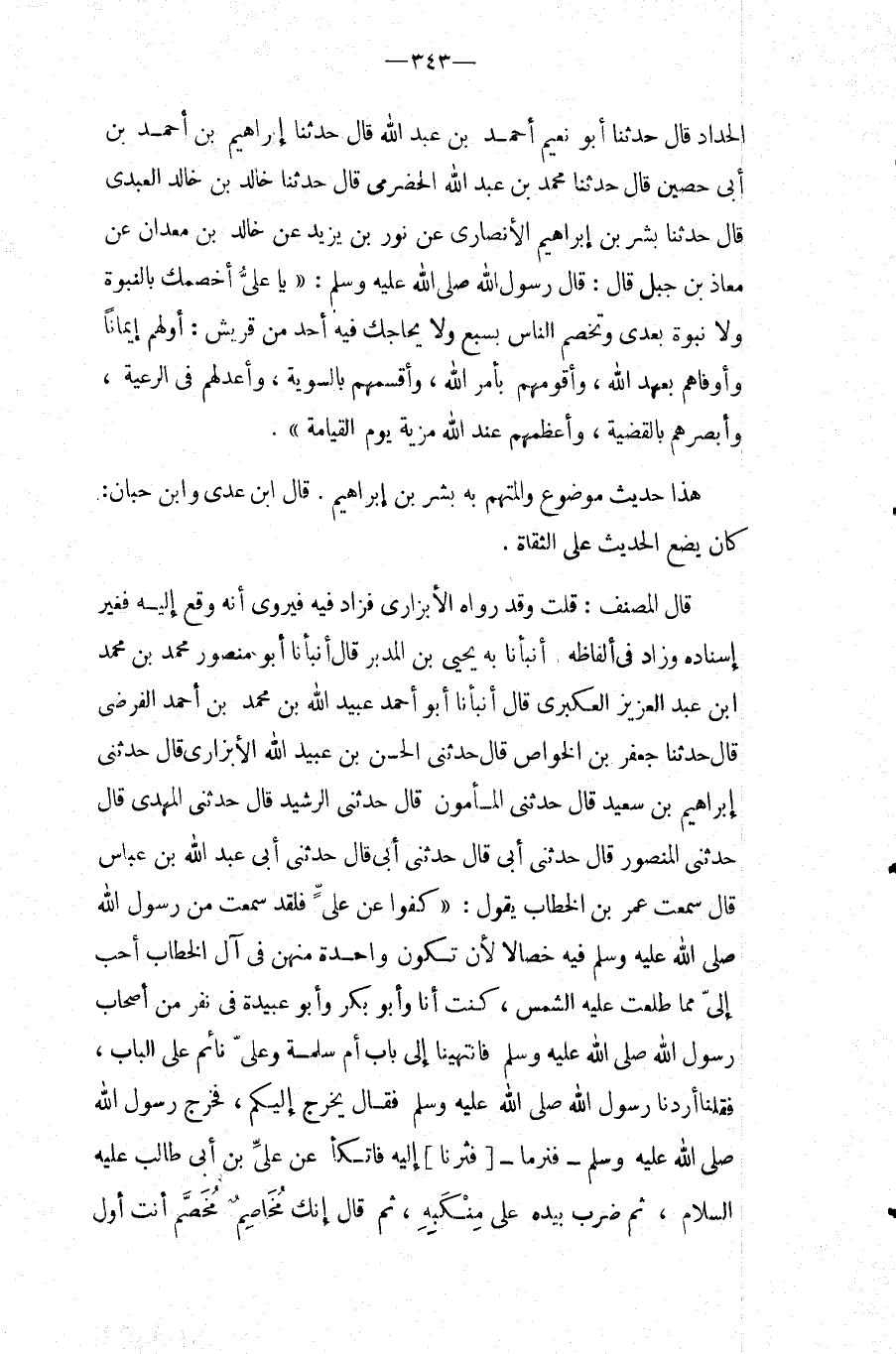 الْحَدَّادِ قَالَ حَدَّثَنَا أَبُو نُعَيْمٍ أَحْمَدَ بْنِ عَبْدِ اللَّهِ قَالَ حَدَّثَنَا إِبْرَاهِيمُ بْنُ أَحْمَدَ بْنِ أَبِي حُصَيْنٍ قَالَ حَدَّثَنَا مُحَمَّدُ بن عبد الله الْحَضْرَمِيُّ قَالَ حَدَّثَنَا خَالِدُ بْنُ خَالِدٍ الْعَبْدِيُّ قَالَ حَدَّثَنَا بِشْرُ بْنُ إِبْرَاهِيمَ الأَنْصَارِيُّ عَنْ نُورِ بْنِ يَزِيدَ عَنْ خَالِدِ بْنِ مَعْدَانَ عَنْ مُعَاذِ بْنِ جَبَلٍ قَالَ: قَالَ رَسُول الله صَلَّى اللَّهُ عَلَيْهِ وَسَلَّمَ: " يَا عَلِيُّ أَخْصُمُكَ بِالنُّبُوَّةِ وَلا نُبُوَّةَ بَعْدِي وَتَخْصُمُ النَّاسَ بِسَبْعٍ وَلا يُحَاجُّكَ فِيهِ أَحَدٌ مِنْ قُرَيْشٍ: أَوَلُهُمْ إِيمَانًا وَأَوْفَاهُمْ بِعَهْدِ اللَّهِ، وَأَقْوَمُهُمْ بِأَمْرِ اللَّهِ، وَأَقْسَمُهُمْ بِالسَّوِيَّةِ، وَأَعْدَلُهُمْ فِي الرَّعِيَّةِ، وَأَبْصَرُهُمْ بِالْقَضِيَّةِ، وَأَعْظَمُهُمْ عِنْدَ اللَّهِ مَزِيَّةً يَوْمَ الْقِيَامَةِ ".