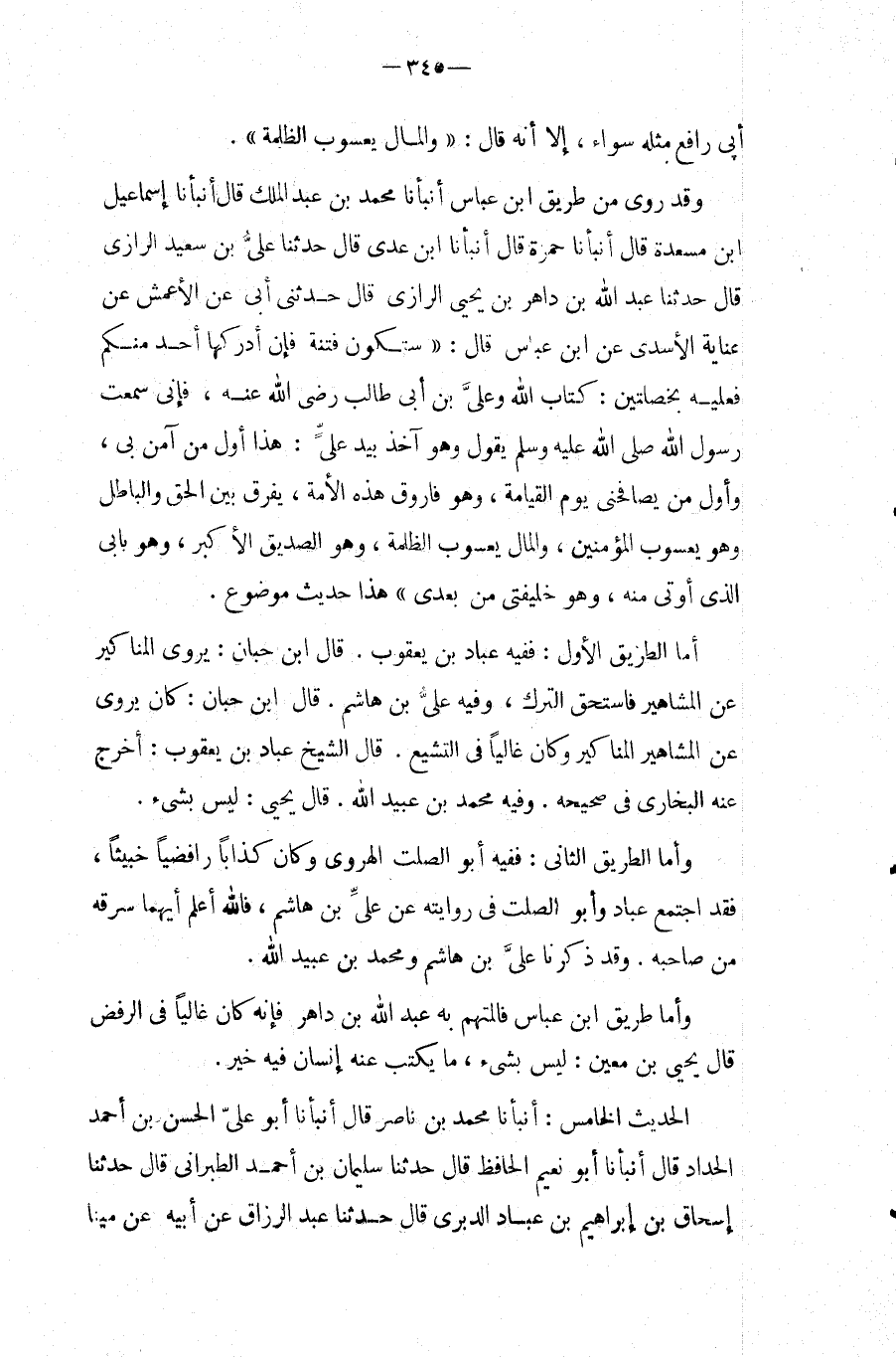 وَأما طَرِيق ابْن عَبَّاس فالمتهم بِهِ عبد الله بن داهر فَإِنَّهُ كَانَ غاليا فِي الرَّفْض قَالَ يَحْيَى بْنُ معِين: لَيْسَ بشئ، مَا يكْتب عَنْهُ إِنْسَان فِيهِ خبر.