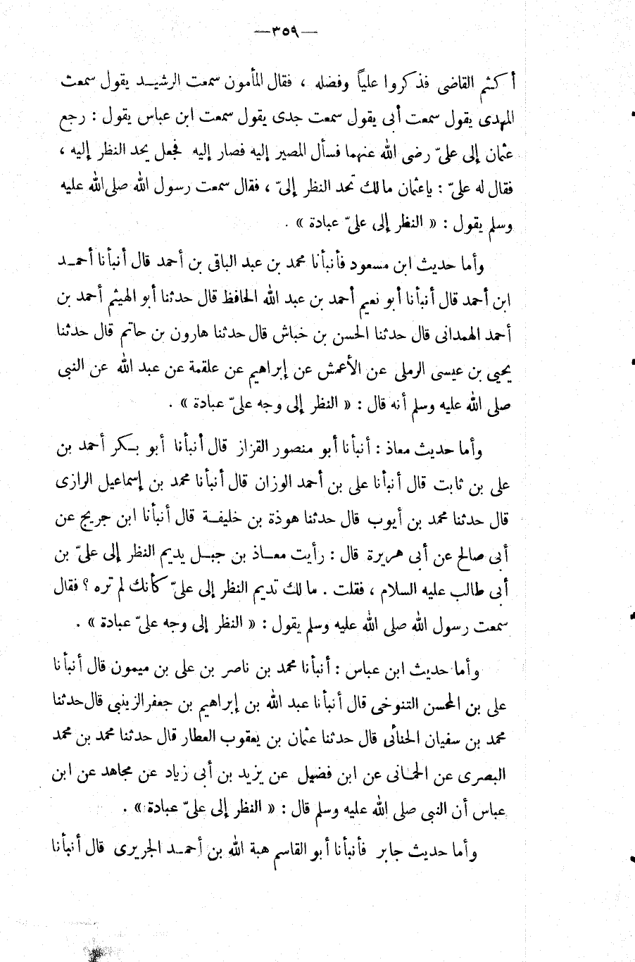 أَكْثَمَ الْقَاضِي فَذَكَرُوا عَلِيًّا وَفَضْلَهُ، فَقَالَ الْمَأْمُونُ سَمِعْتُ الرَّشِيدَ يَقُولُ سَمِعْتُ الْمَهْدِيَّ يَقُولُ سَمِعْتُ أَبِي يَقُول سَمِعت جدي يَقُول سَمِعت ابْنَ عَبَّاسٍ يَقُولُ: رَجَعَ عُثْمَانُ إِلَى عَلِيٍّ رَضِيَ اللَّهُ عَنْهُمَا فَسَأَلَ الْمَصِيرُ إِلَيْهِ فَصَارَ إِلَيْهِ فَجَعَلَ يَحِدُّ النَّظَرَ إِلَيْهِ، فَقَالَ لَهُ عَلِيٌّ: يَا عُثْمَانَ مَالَكَ تَحِدُّ النَّظَر إِلَيَّ، فَقَالَ سَمِعْتُ رَسُول الله صَلَّى اللَّهُ عَلَيْهِ وَسَلَّمَ يَقُولُ: " النَّظَرُ إِلَى عَلِيٍّ عِبَادَةٌ ".