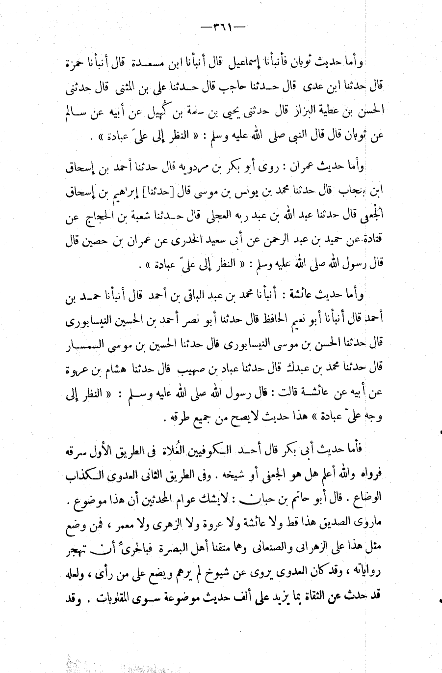 وَأما حَدِيث عَائِشَة: أَنْبَأَنَا مُحَمَّدُ بْنُ عَبْدِ الْبَاقِي بْنِ أَحْمَدَ قَالَ أَنْبَأَنَا حَمَدُ بْنُ أَحْمَدَ قَالَ أَنْبَأَنَا أَبُو نُعَيْمٍ الْحَافِظُ قَالَ حَدَّثَنَا أَبُو نَصْرٍ أَحْمَدُ بْنُ الْحُسَيْنِ النَّيْسَابُورِيُّ قَالَ حَدَّثَنَا الْحَسَنُ بْنُ مُوسَى النَّيْسَابُورِيُّ قَالَ حَدَّثَنَا الْحُسَيْنُ بْنُ مُوسَى السِّمْسَارُ قَالَ حَدَّثَنَا مُحَمَّدُ بْنُ عَبْدَكَ قَالَ حَدَّثَنَا عَبَّادُ بْنُ صُهَيْبٍ قَالَ حَدَّثَنَا هِشَامُ بْنُ عُرْوَةَ عَنْ أَبِيهِ عَنْ عَائِشَةَ قَالَتْ: قَالَ رَسُول الله صَلَّى اللَّهُ عَلَيْهِ وَسَلَّمَ: " النَّظَرُ إِلَى وَجْهِ عَلِيٍّ عِبَادَةٌ " هَذَا حَدِيث لَا يَصح من جَمِيع طرقه.