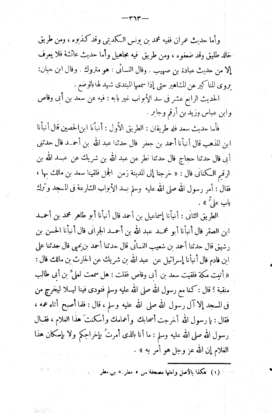 فَأَما حَدِيث سعد فَلهُ طَرِيقَانِ: الطَّرِيق الأول: أَنْبَأَنَا ابْنُ الْحُصَيْنِ قَالَ أَنْبَأَنَا ابْنُ الْمُذْهِبِ قَالَ أْنَبَأَنَا أَحْمَدُ بْنُ جَعْفَرٍ قَالَ حَدَّثَنَا عبد الله بْنُ أَحْمَدَ قَالَ حَدَّثَنِي أَبِي قَالَ حَدَّثَنَا حَجَّاجٌ قَالَ حَدَّثَنَا نطر عَن عبد الله بن شريك عَن عبد الله بْنِ الرَّقِيمِ الْكِنَانِيِّ قَالَ: " خَرَجْنَا إِلَى الْمَدِينَةِ زَمَنَ الْجَمَلِ فَلَقِينَا سَعْدَ بْنَ مَالِكٍ بِهَا، فَقَالَ: أَمَرَ رَسُولُ اللَّهِ صَلَّى اللَّهُ عَلَيْهِ وَسَلَّمَ بِسَدِّ الأَبْوَابِ الشَّارِعَةِ فِي الْمَسْجِدِ وَتَرْكِ بَابِ عَلِيٍّ ".