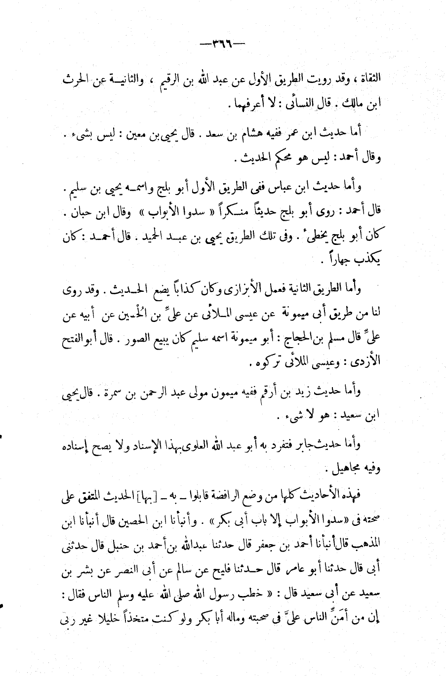فَهَذِهِ الأَحَادِيثُ كُلُّهَا مِنْ وضع الرافضة قابلوا بِهِ [بِهَا] الْحَدِيثُ الْمُتَّفَقُ عَلَى صِحَّتِهِ فِي " سُدُّوا الأَبْوَابَ إِلا بَابَ أَبِي بَكْرٍ ".